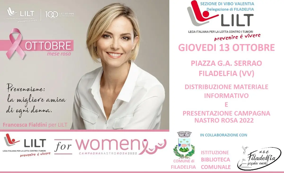 Non solo l’inaugurazione di una panchina rosa, a Filadelfia si terrà anche un’altra iniziativa per incentivare la prevenzione contro i tumori, specie quelli femminili. La delegazione Lilt (Lega italiana per la lotta contro i tumori) di Filadelfia annuncia infatti una giornata dedicata alle donne, con visite gratuite. Il tutto – riferisce il referente Tonino Gugliotta – organizzato con il patrocinio del Comune e grazie alla collaborazione dell’Istituzione biblioteca comunale e dell’Asc Filaldelfia Popular Events, che il 13 ottobre – durante la presentazione della campagna Nastro rosa – si occuperà di distribuire materiale informativo, e grazie al costante impegno del dottor Franco Petrolo, presidente della sezione di Vibo Valentia. [Continua in basso]