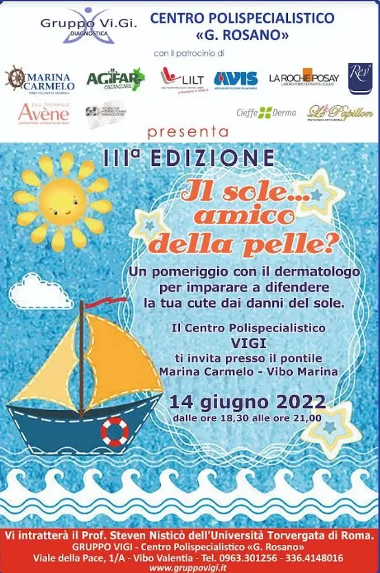 Martedì 14 giugno tra le passerelle del pontile del Marina Carmelo a Vibo Valentia Marina, dalle 18.30 alle 21.00 il gruppo Vi.Gi. promuove la terza edizione dell’ evento: Il sole amico della pelle? «Parola d’ordine per la salute e la prevenzione dai danni solari è: attenzione, – dice Mariateresa Rosano, coordinatrice del Gruppo Vi.Gi. e promotrice dell’ evento – attenzione al modo in cui ci esponiamo ai raggi UV e anche al saper riconoscere i segni che ne identificano i potenziali traumi sul nostro corpo. L’estate è la stagione in cui non solo il nostro viso è maggiormente esposto al sole ed è per questo che come Gruppo Vi.Gi., da sempre attenti alla salute delle persone, promuoviamo per il terzo anno un evento di sensibilizzazione gratuito e aperto a tutti».