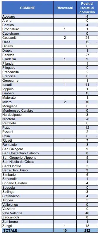 Per quanto riguarda i 10 ricoverati, sono così ripartiti: uno è di Brognaturo, due di Cessaniti, uno di Filadelfia, uno di Gerocarne, uno di Ionadi, due di Mileto, uno di Ricadi e uno di Zungri.