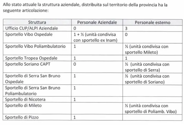 Il progetto nasce altresì da un ragionamento fatto sul numero di dipendenti su cui l’Azienda sanitaria provinciale può contare per le attività di prenotazione e riscossione ticket [Vedi tabella in basso]. Nel breve periodo sono previsti tra l’altro due pensionamenti, il ché renderà ancora più risicata la pianta organica. «Tale condizione – è scritto nel progetto – allo stato delle cose renderebbe il servizio di prenotazione e riscossione ticket quasi esclusivamente dipendente dalla gestione in convenzione delle farmacie, le quali seppur distribuite sul territorio, non hanno aderito su Vibo centro, lasciando privo di servizio la città capoluogo».