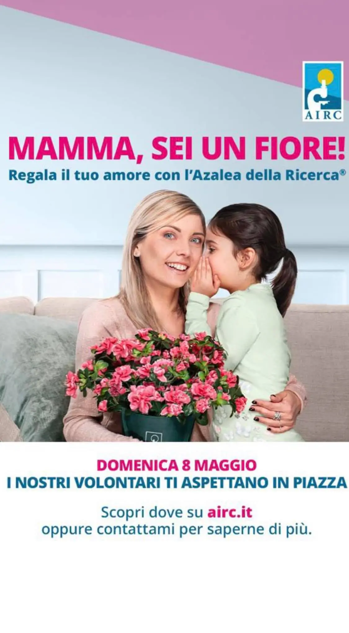 Domenica otto maggio, in occasione della festa della mamma, l’azalea dell’Airc (Fondazione italiana per la ricerca sul cancro) tornerà a colorare tante piazze in tutta Italia per sostenere gli studiosi che sono impegnati nel fornire diagnosi sempre più precoci e ricercare terapie efficaci e veloci per i tumori che colpiscono le donne.