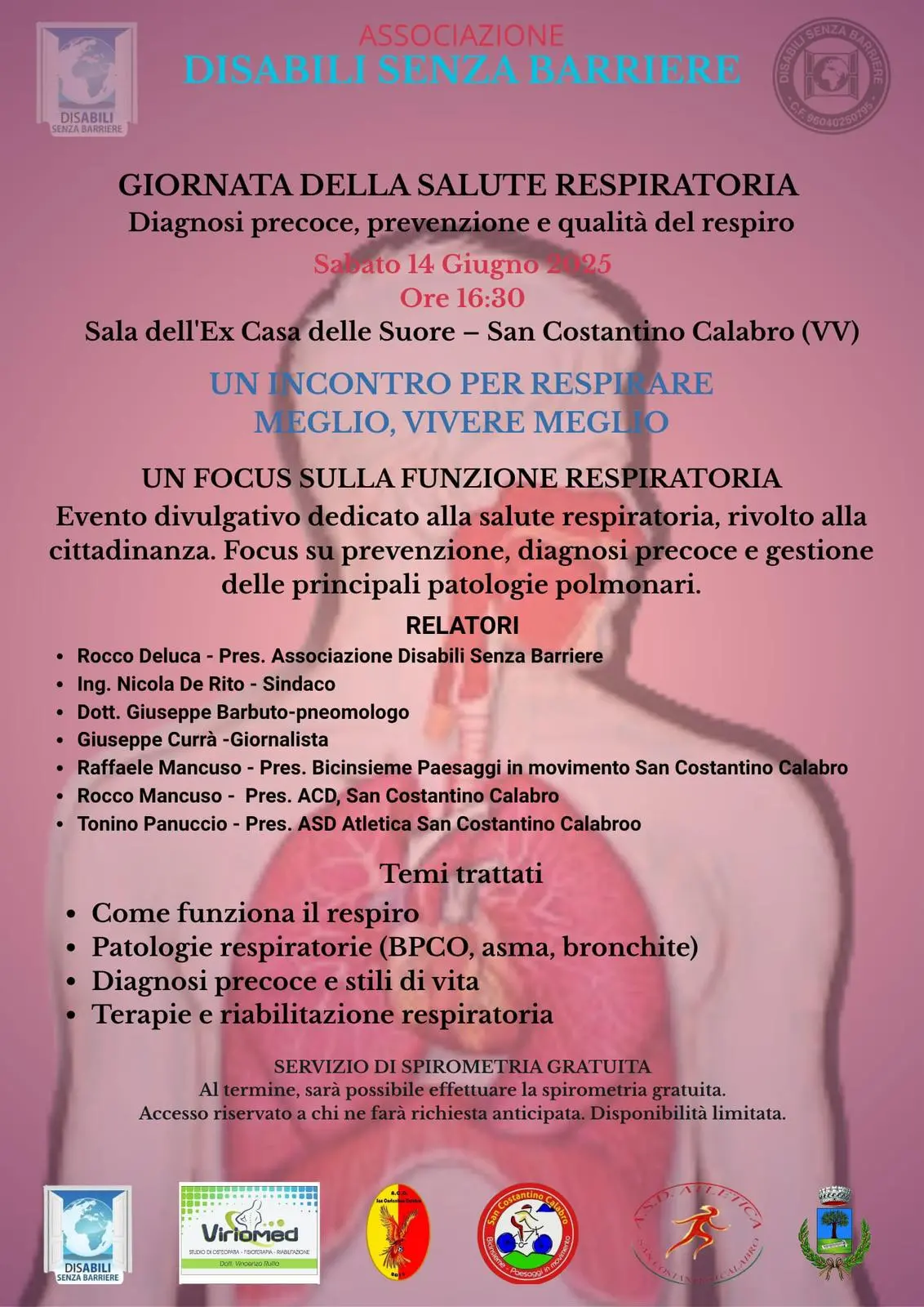 Ennesima interessante iniziativa messa in cantiere a San Costantino Calabro dalla locale associazione Onlus “Disabili senza barriere”. Si tratta della “Giornata della Salute respiratoria – Diagnosi precoce, prevenzione e qualità del respiro” in programma domani 14 giugno all’interno della sala dell’ex casa in cui erano allocate le Suore della Carità. L’evento medico-divulgativo rivolto alla cittadinanza prenderà il via alle 16.30. Un incontro per respirare e vivere meglio che, così come spiega il presidente della realtà di terzo settore Rocco Deluca, «permetterà di focalizzare l’attenzione anche sulla gestione delle principali patologie polmonari». Tra i temi trattati, le modalità di funzione del respiro, patologie come la broncopneumopatia cronica ostruttiva (Bpco), l’asma e la bronchite, l’importanza di un corretto stile di vita, le terapie e la riabilitazione respiratoria. All’incontro pubblico interverranno, tra gli altri, lo stesso presidente di “Disabili senza Barriere” Deluca, il sindaco Nicola Derito, i presidenti di “Bicinsieme. Paesaggi in movimenti”, Raffaele Mancuso, dell’“Acd San Costantino Calabro”, Rocco Mancuso, dell’Asd Atletica San Costantino, Tonino Panuccio. A relazionare sull’argomento e a rispondere alle eventuali domande poste dai presenti in sala sarà l’apprezzato pneumologo vibonese Giuseppe Barbuto, per anni responsabile del Reparto di Medicina del presidio ospedaliero di Tropea. Al termine della “Giornata della Salute respiratoria” sarà attivato il Servizio di spirometria gratuita. Vista la disponibilità limitata, l’accesso sarà riservato a chi ne avrà fatto richiesta preventivamente.