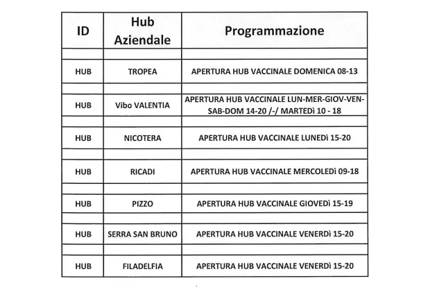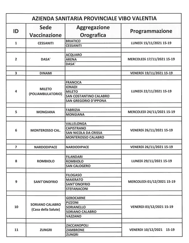 L’Azienda sanitaria provincia di Vibo Valentia ha pubblicato il Piano della vaccinazione anti covid per over 60 (3° dose) e over 12 che non hanno ancora iniziato o completato il ciclo vaccinale ordinario (prima e/o seconda dose). Non è necessaria la prenotazione.
