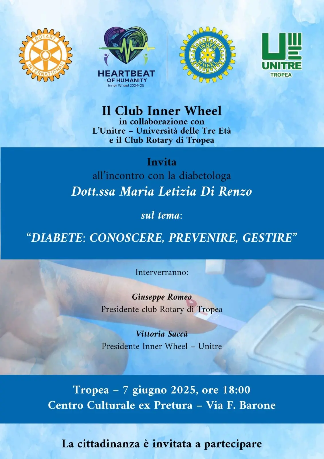 Il prossimo 7 giugno, alle ore 18, al Centro culturale provinciale (ex Pretura) in via Francesco Barone a Tropea si terrà un incontro sul tema del diabete, intitolato “Diabete: Conoscere, Prevenire, Gestire”. L’iniziativa è promossa dal Club Inner Wheel di Tropea in collaborazione con L’Unitre – Università delle Tre Età e il Club Rotary di Tropea, a dimostrazione di una sinergia tra associazioni locali nell’interesse della comunità. L’evento vedrà la partecipazione della diabetologa Maria Letizia Di Renzo che guiderà l’approfondimento sulle diverse sfaccettature della malattia. L’incontro è stato strutturato per offrire strumenti di conoscenza e strategie pratiche per la prevenzione e la gestione del diabete, una patologia che incide significativamente sulla qualità della vita di molti individui. A intervenire saranno anche figure di spicco del panorama associativo locale: il presidente del Club Rotary di Tropea, Giuseppe Romeo, e la presidente Inner Wheel – Unitre, Vittoria Saccà. La loro presenza sottolinea l’impegno delle rispettive organizzazioni nella sensibilizzazione e nel supporto alla cittadinanza su tematiche di rilevanza sociale e sanitaria.