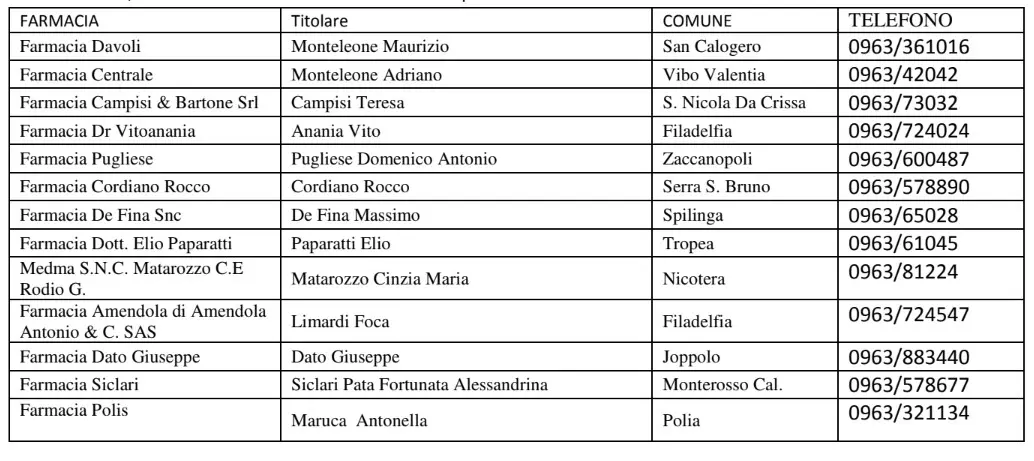 Dal primo gennaio di quest’anno hanno chiuso i battenti i centri vaccinali per la somministrazione del siero anti Covid. Nell’ambito della riorganizzazione della vaccinazione anti Covid-19, come concordato con il presidente dell’Ordine dei farmacisti ed al fine di garantire all’utenza un servizio distribuito in modo più capillare sull’intero territorio della provincia di Vibo Valentia, l’Asp comunica che è possibile effettuare la vaccinazione anti Covid-19 presso tredici farmacie convenzionate, accreditate e che hanno dato la loro disponibilità. È necessaria la prenotazione. Di seguito l’elenco delle farmacie interessate. [Continua in basso]