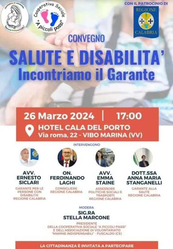Nel mondo, circa una persona su sei presenta almeno una disabilità fisica, intellettiva o sensoriale permanente. Per queste ragioni si possono incontrare difficoltà nello svolgimento delle normali attività quotidiane. Le disabilità sono molte e conoscere i diversi aspetti e le necessità individuali è fondamentale per agire adeguatamente al fine di migliorare le condizioni di vita. Un convegno per programmare progetti aventi come scopo quello di aiutare le persone con disabilità, fornendo nel contempo un servizio alle tante famiglie che devono affrontare infiniti problemi, è in programma per martedì 26 marzo alle ore 17 presso l’hotel “Cala del Porto” di Vibo Marina. Il meeting, patrocinato dalla Regione Calabria, è stato organizzato dalla cooperativa sociale “A piccoli passi”, presieduta da Stella Marcone e dall’associazione di volontariato “Mamme Indispensabili”. Sono previsti gli interventi dell’avvocato Ernesto Siclari, garante per le persone con disabilità-Regione Calabria; di Ferdinando Laghi, consigliere regionale; dell’assessore regionale alle Politiche Sociali, Emma Staine; di Anna Maria Stanganelli, garante alla salute- Regione Calabria.