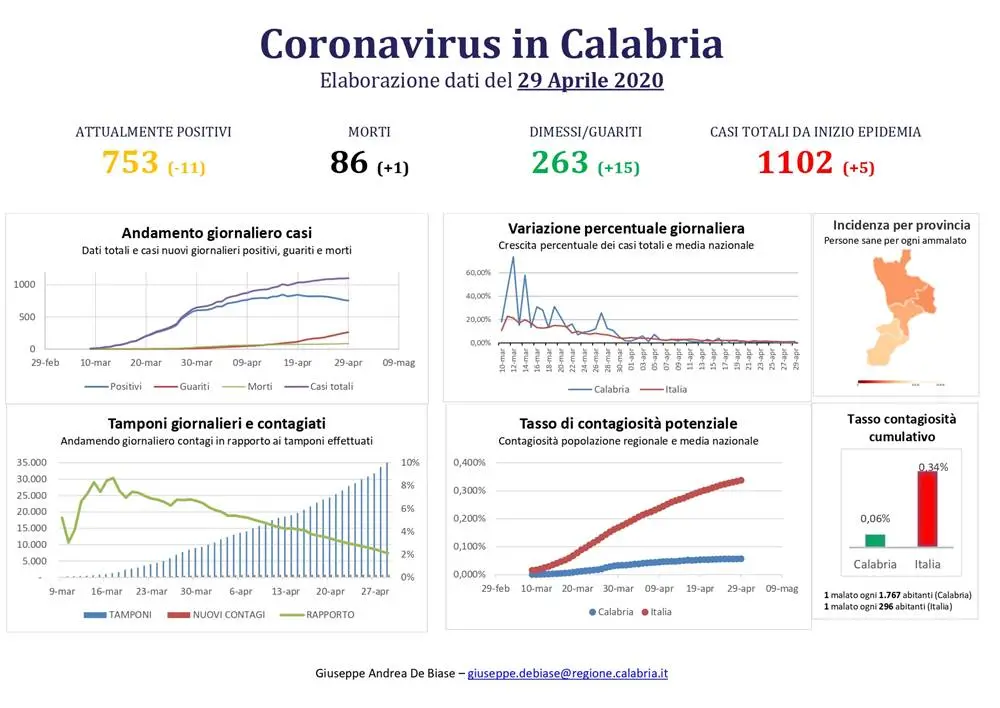 In Calabria ad oggi sono stati effettuati 32.961 tamponi. Le persone risultate positive al Coronavirus sono 1.102 (+5 rispetto a ieri), quelle negative sono 31.859.