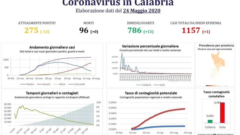 Il totale dei casi di Catanzaro comprende soggetti provenienti da altre strutture e province che nel tempo sono stati dimessi. Tuttavia il dato cumulativo regionale dei casi confermati, nonché quello di Reggio Calabria, rimangono invariati in quanto è stato verificato definitivamente come negativo (su due tamponi di controllo) un caso positivo di Polistena del 20 maggio, che era stato ritestato per un supposto problema tecnico.