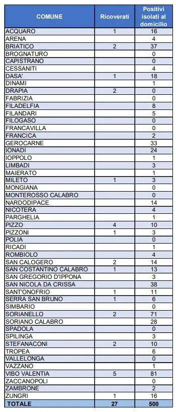 Per quanto riguarda i 27 ricoverati, sono così ripartiti: uno è di Acquaro, due di Briatico, uno di Dasà, due di Drapia, uno di Mileto, quattro di Pizzo, uno di Pizzoni, due di San Calogero, uno di San Costantino Calabro, uno di Sant’Onofrio, uno di Serra San Bruno, due di Sorianello, due di Stefanaconi, cinque di Vibo Valentia e uno di Zungri.