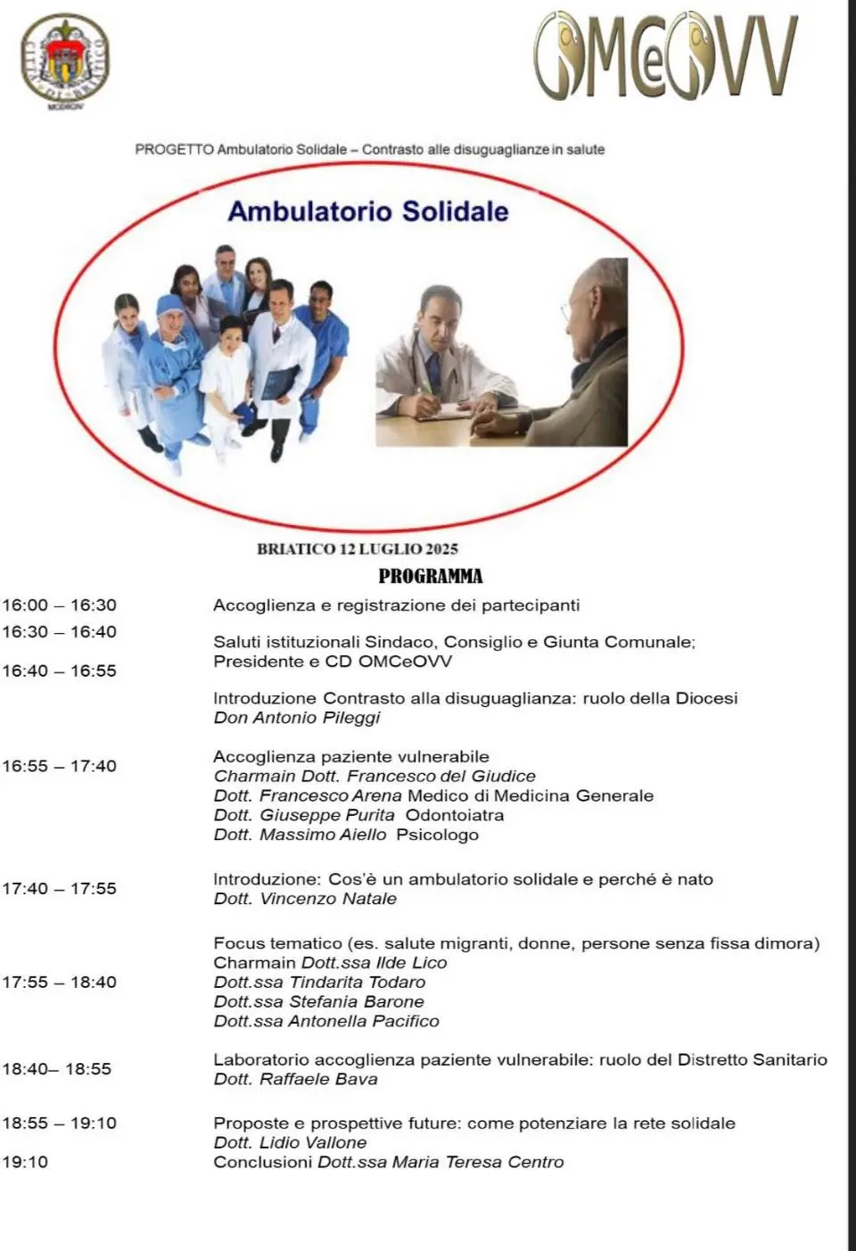 Una mano tesa nei confronti dei più fragili, anziani e disabili in primis. Ma soprattutto, un punto di riferimento per garantire anche alle fasce meno abbienti, una sanità degna di un Paese civile e superare le disuguaglianze su salute e accesso alle cure. Su queste basi, il Comune di Briatico rappresentato dal sindaco Lidio Vallone, ha deciso di aderire all’iniziativa dell’ordine dei medici di Vibo Valentia per la costituzione dell’Ambulatorio solidale. Si tratta di un servizio che si avvarrà della consulenza di medici specialisti, tecnici professionisti e di personale infermieristico altamente qualificato, i quali, a titolo completamente gratuito, espleteranno visite e prestazioni. Il progetto verrà presentato il 12 luglio alle 16.30 al centro polifunzionale di via Crispi.