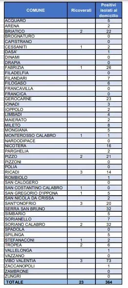 Secondo la tabella Asp, è la città capoluogo il centro con il maggior numero di casi attivi, ben 76 (di cui 73 in isolamento domiciliare e 3 ricoverati). Seguono Soriano Calabro, 32 contagiati che si trovano a casa più 2 in ospedale, e Serra San Bruno con 32 persone positive in isolamento domiciliare.