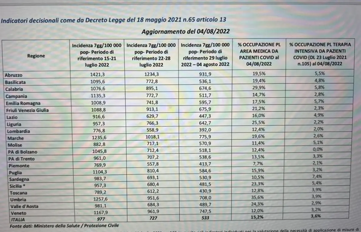 In Italia l’incidenza settimanale di contagi Covid, con 533 casi per 100 mila abitanti rispetto ai 727 della precedente rilevazione, continua la sua discesa. Per quanto riguarda i ricoveri, il tasso di occupazione nelle terapie intensive è al 3,6% rispetto al 4,1% di sette giorni fa di sette giorni fa. Cala anche il numero pazienti in area non critica che si attestano 15,2% rispetto al 17% della scorsa settimana. È quanto emerge dal monitoraggio settimanale Covid curato dall’Istituto superiore di Sanità riguardante il periodo di riferimento che va dal 29 luglio al 4 agosto. Dato interessante quello relativo all’indice Rt che scende a 0.90 rispetto all’1.06 della scorsa rilevazione.