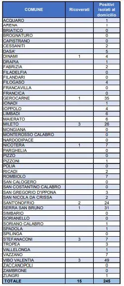 È Vibo Valentia il centro con il maggior numero di postivi: 53 (di cui 49 in isolamento domiciliare e 3 ricoverati). Seguono Gerocarne, dove sono 35 i contagiati che si trovano a casa più 1 in ospedale, e Serra San Bruno, con 31 positivi in casa e uno ricoverato.
