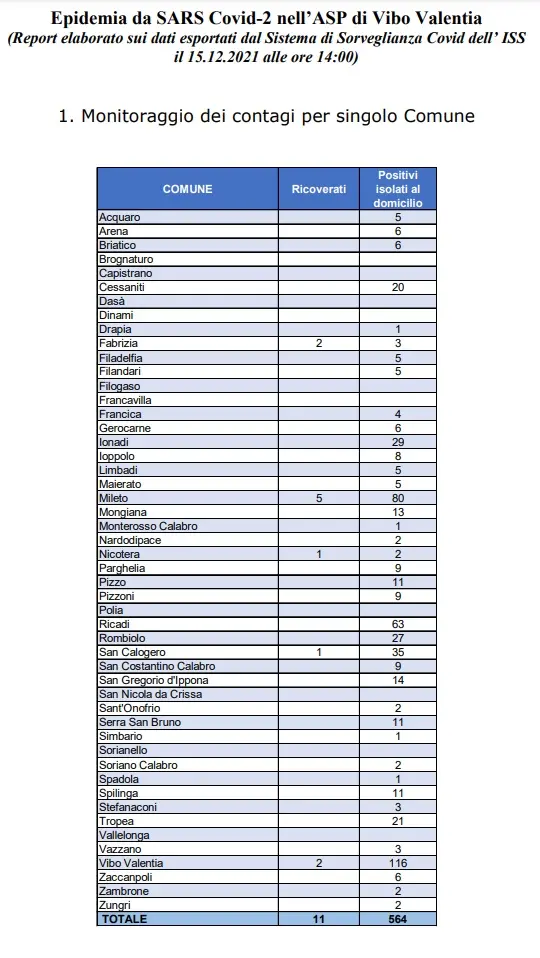 Il Covid-19 continua a preoccupare il comprensorio vibonese. Con 564 contagi e 11 pazienti ricoverati, la provincia di Vibo Valentia è la seconda provincia in Calabria, dopo Reggio Calabria, con il maggiore numeri di casi. Il dato -confrontato ai nuovi positivi per 100.000 abitanti dell’ultima settimana- è stato registrato dalla fondazione Gimbe. Proprio ieri, l’Asp di Vibo Valentia ha stilato il report sui positivi Comune per Comune.