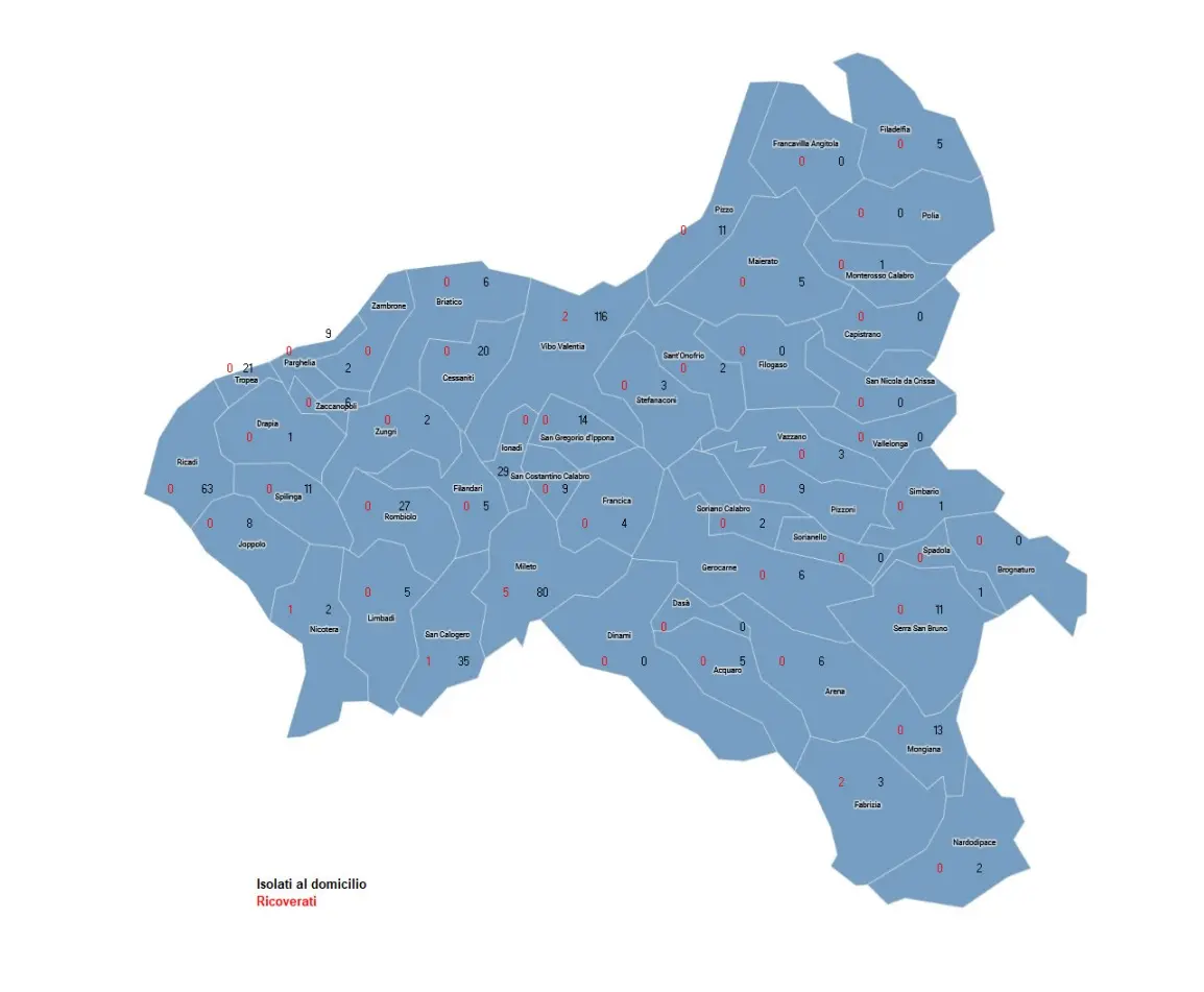 Tra i centri più colpiti dall’ondata pandemica risultano Mileto, con 80 casi e 5 persone ricoverate. Ben 63 i contagi nel piccolo centro costiero di Ricadi, 35 a San Calogero (1 ricovero), 21 a Tropea e 116 a Vibo città. Sotto stretta osservazione i territori di Ionadi, dove risultano 29 casi; Rombiolo con 27 positivi e Cessaniti in cui se ne registra 20. Situazione tutto sommato tranquilla nell’entroterra. Brognaturo, Capistrano, Dasà, Dinami, Filogaso, Francavilla, San Nicola da Crissa, Polia, Sorianello e Vallelonga si mantengono ad oggi Covid free.