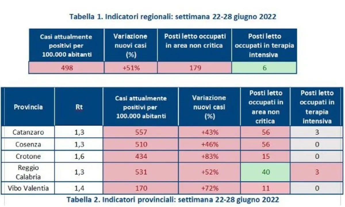 Su base regionale, cresce e di tanto la percentuale di nuovi casi, che supera un incremento del 50%. Gli attualmente positivi ogni 100mila abitati raggiungono i 498 nuovi casi, trainati dalle province di Catanzaro (557 casi ogni 100mila abitanti) e Reggio Calabria (531 attualmente positivi ogni 100 mila abitanti). L’incremento percentuale più importante di nuovi casi è a Crotone (83%) ma tutte le province sono osservate speciali per un Rt che non scende mai sotto l’1,3, un dato molto pesante.