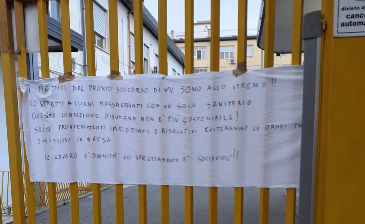 «I medici del pronto soccorso di Vibo Valentia sono allo stremo! Costretti a turni massacranti, coperti quasi sempre da un solo sanitario. È impossibile gestire contemporaneamente le emergenze-urgenze e i ricoveri in assenza di posti letto (quasi sempre) o di reparti (medicina). Questa condizione disumana che si è sopportata fino adesso, non è più sostenibile! Non può il singolo medico, a proprio rischio, dare una risposta ai problemi inveterati del sistema sanitario. Solo provvedimenti immediati e risolutivi, eviteranno, le ormai imminenti dimissioni in massa. Il lavoro è dignità, lo sfruttamento è schiavitù». È il testo dello striscione improvvisato che un medico del Pronto soccorso di Vibo Valentia ha affisso su uno dei cancelli dell’ospedale Jazzolino di Vibo Valentia. Un appello disperato rivolto implicitamente al commissario dell’Azienda sanitaria provinciale e al commissario regionale alla sanità, Roberto Occhiuto, affinché prendano piena coscienza di una situazione indegna di un paese civile, che non solo mortifica il lavoro di chi opera in ospedale, ma soprattutto mette a rischio l’assistenza sanitaria di base rivolta ai cittadini. L’accorato appello, scritto su un lenzuolo bianco, è stato subito rimosso ma la denuncia pubblica ha fatto in tempo a deflagrare in tutta la sua forza. [Continua in basso]