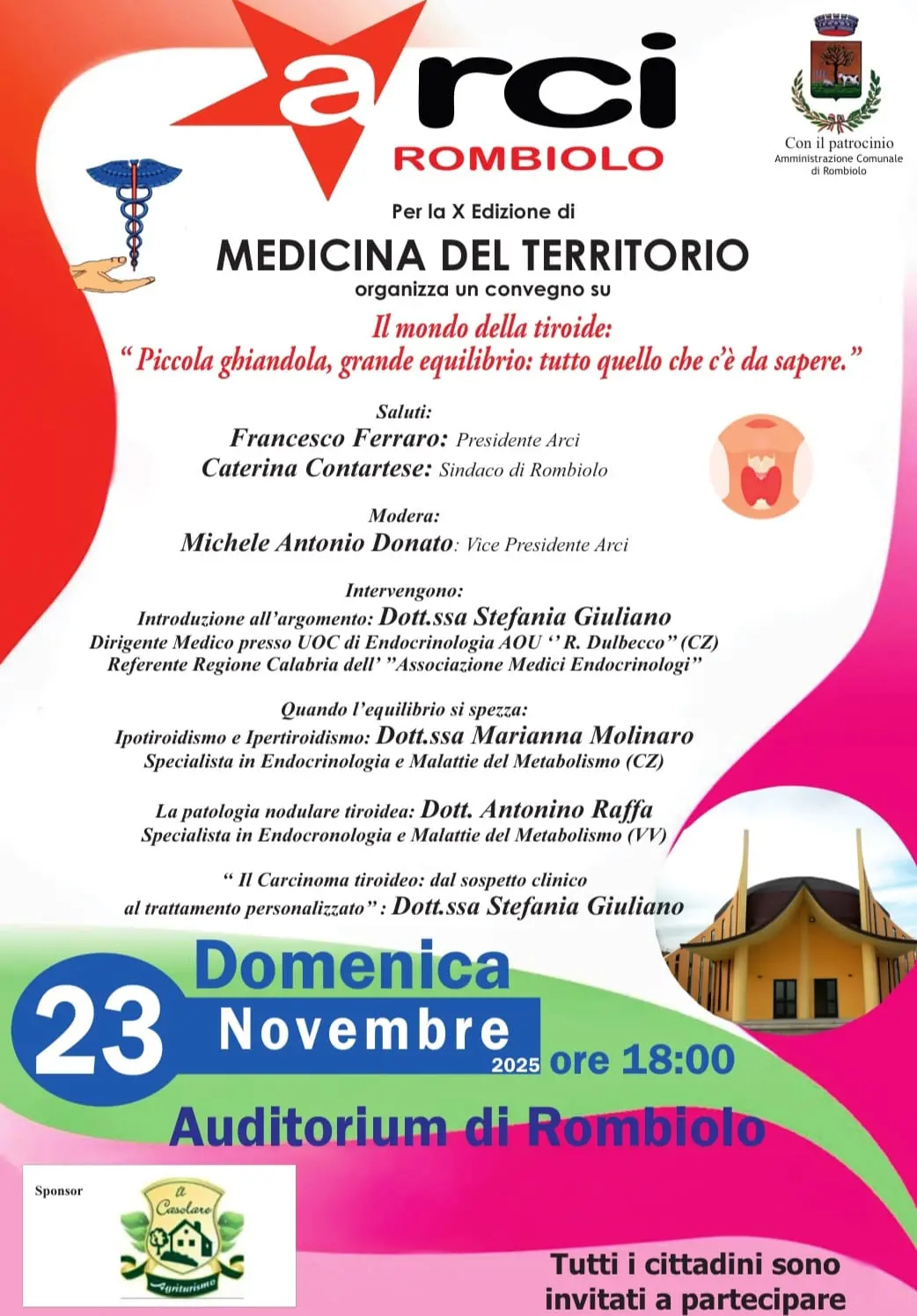 “Il mondo della tiroide: Piccola ghiandola, grande equilibrio, tutto quello che c'è da sapere”. Questo il titolo del convegno in programma domenica 23 novembre a Rombiolo, promosso dal locale circolo Arci con il patrocinio dell'amministrazione comunale. L'incontro, moderato dal vice presidente Arci Michele Antonio Donato , fa parte dell'annuale rassegna “ Medicina del territorio”, giunta alla sua decima edizione. Il tutto si svolgerà all'interno dell'Auditorium cittadino, a partire dalle ore 18. Dopo i saluti di rito del presidente Arci, Francesco Ferraro, e del sindaco di Rombiolo, Caterina Contartese, l'evento proseguirà con gli interventi in sala di diversi esperti del settore. Ad introdurre l'argomento sarà, nello specifico, la dottoressa Stefania Giuliano, dirigente medico presso l'Unità operativa di Endocrinologia dell'Azienda ospedaliera universitaria “ Renato Dulbecco ” di Catanzaro, nonché referente regionale dell'associazione “Medici endocrinologi”.