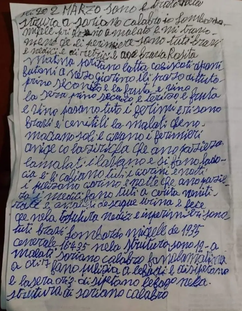 Un gesto ricco d’amore e non è da tutti riuscire ad avere il coraggio di esternare le proprie emozioni, soprattutto quando le condizioni di salute non sono le migliori. Ma Michele, con profondo coraggio e dignità, non ha potuto fare a meno di prendere un biglietto e scrivere «grazie» a tutto il personale. Nella lettera, non perfettamente leggibile, si evincono chiaramente alcuni concetti: «Tutti i medici e tutti gli infermieri sono bravi, fanno la pulizia e disinfettano la sera, a mezzogiorno ci portano il pranzo: primo, secondo, la frutta e il vino, gli infermieri sono bravi e gentili, i medici fanno tutti gli esami». E’ chiaro il profondo benessere di Michele – e probabilmente di tutti gli anziani ricoverati – all’interno della struttura sanitaria.