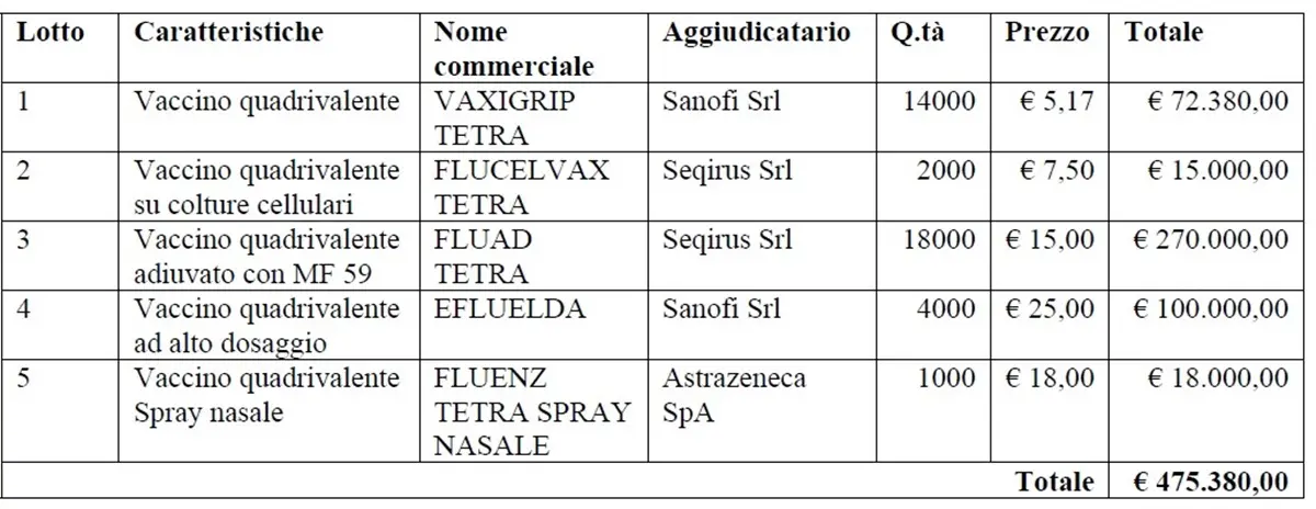 La Stazione unica appaltante della Regione Calabria ha comunicato, a suo tempo, all’Asp l’avvenuta aggiudicazione della procedura di gara per la stipula di accordi quadro per la fornitura di vaccini anti influenzali per la nuova campagna di vaccinazione invernale. Con la suddetta «comunicazione, la Sua ha autorizzato le Aziende del servizio sanitario regionale, tenuto conto della necessità da parte delle stesse Asp di provvedere all’avvio in tempo utile di ogni attività preparatoria della campagna vaccinale 2022/2023, nelle more della stipula dei rispettivi accordi quadro, a procedere, per quanto necessario, all’emissione degli ordinativi di fornitura nel rispetto dei fabbisogni previsti e comunicati in fase di approvazione di gara». Il direttore facente funzioni della Struttura complessa di igiene, epidemiologia e sanità pubblica dell’Asp Antonino Demonte ha quindi individuato il direttore dell’esecuzione del contratto della fornitura Francesca Iozzo, dirigente medico afferente alla medesima Struttura complessa, ed ha trasmesso il fabbisogno per la campagna di vaccinazione anti influenzale 2022/2023. per come risulta nella tabella che riporta il numero del lotto, le caratteristiche, il numero commerciale, l’aggiudicatario, la quantità di dosi, il prezzo di ciascuna dose e il totale.