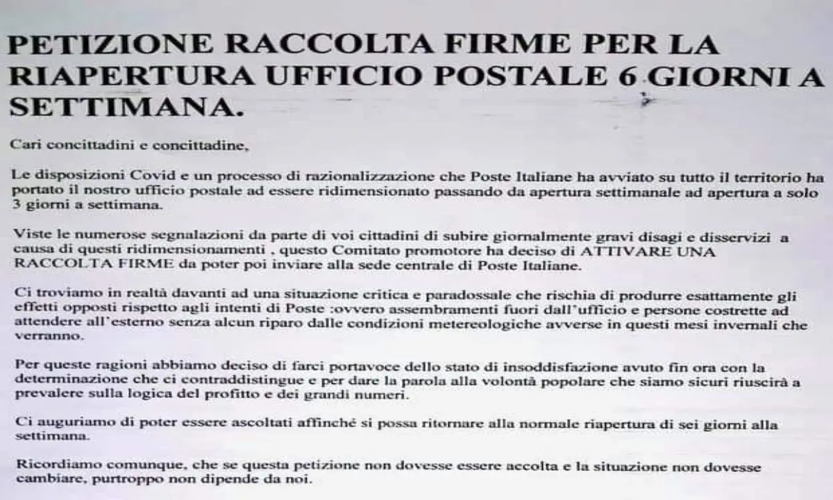 «Dopo numerose richieste, sia telefoniche che scritte, da parte di questa amministrazione per ripristinare l’apertura dell’ufficio postale non a giorni alterni, ma dal lunedì al sabato come era nel periodo pre Covid, abbiamo deciso di avviare – scrive il primo cittadino – una petizione popolare, coinvolgendo tutti voi alla nostra battaglia».