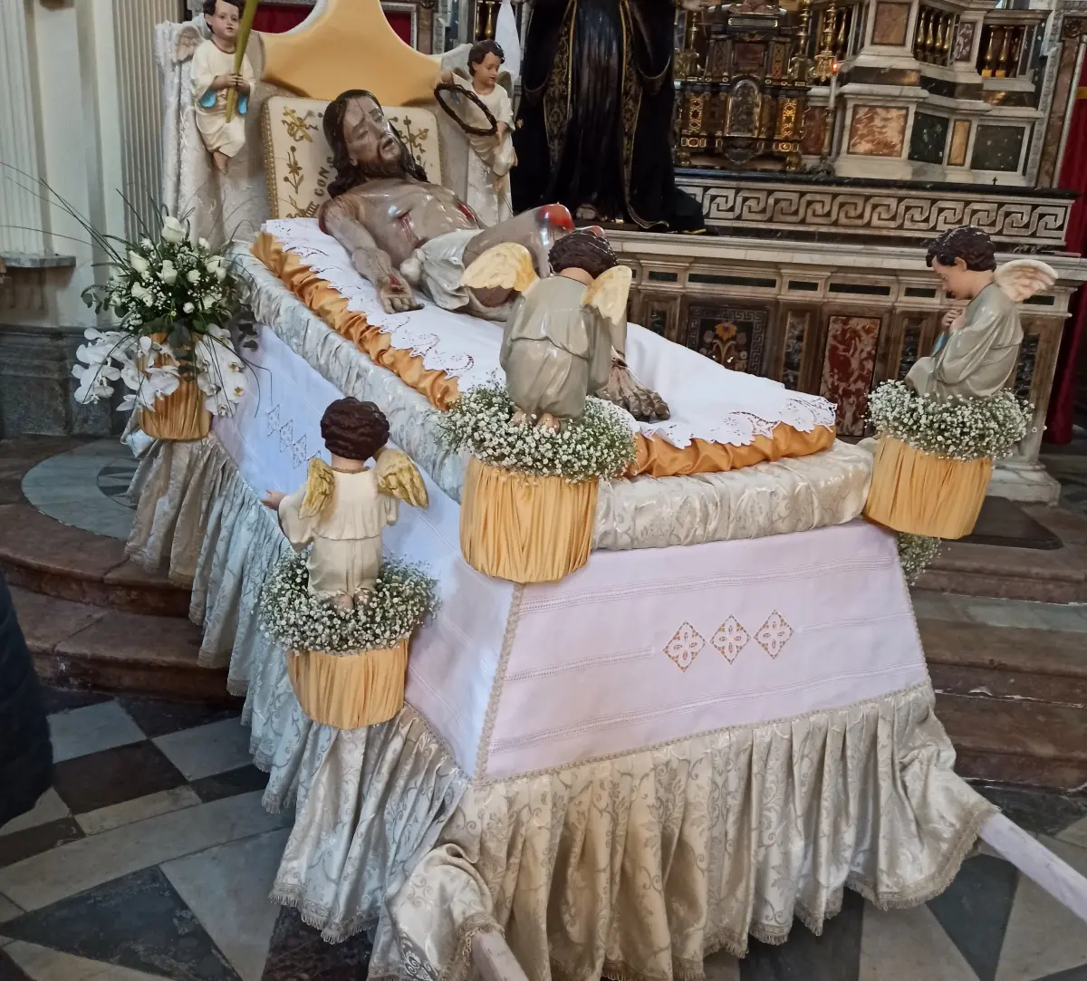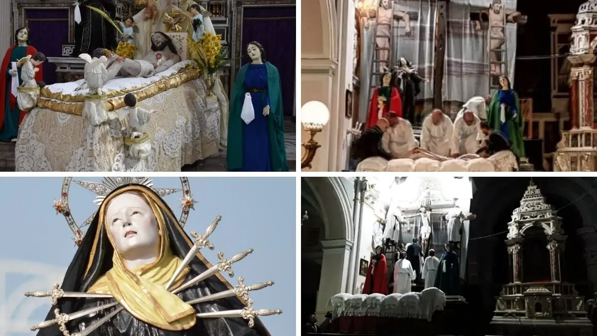 La statua del Cristo insieme alla croce vengono portate già qualche giorno prima nella chiesa matrice. Dopo questi trasferimenti alla destra dell’altare viene preparato un palco che viene chiuso con un grande tendone: «In questo spazio– evidenzia il priore – viene issata una croce sulla quale viene fissata (inchiodata) la statua del Cristo. Venerdì Santo alla fine della funzione religiosa, viene aperto il tendone e ai fedeli viene mostrata la scena con il Cristo crocifisso insieme ai due ladroni. Ai piedi della croce gli uomini che devono deporre dalla croce Gesù. Questi – aggiunge – salgono con le scale, tirano via i chiodi dai piedi e dalle mani del Cristo, le braccia snodate vengono girate lungo i fianchi e quindi la statua viene deposta sul letto mortuario. Dopodiché il Cristo viene portato in processione insieme alla Madonna Addolorata, San Giovanni e alla Maddalena. L’intero gruppo raggiunge la chiesa dell’Addolorata». Nella tarda serata (circa le ore 23) la statua del Cristo viene adagiata sulla “naca” (dal greco, culla sospesa). [Continua in basso]