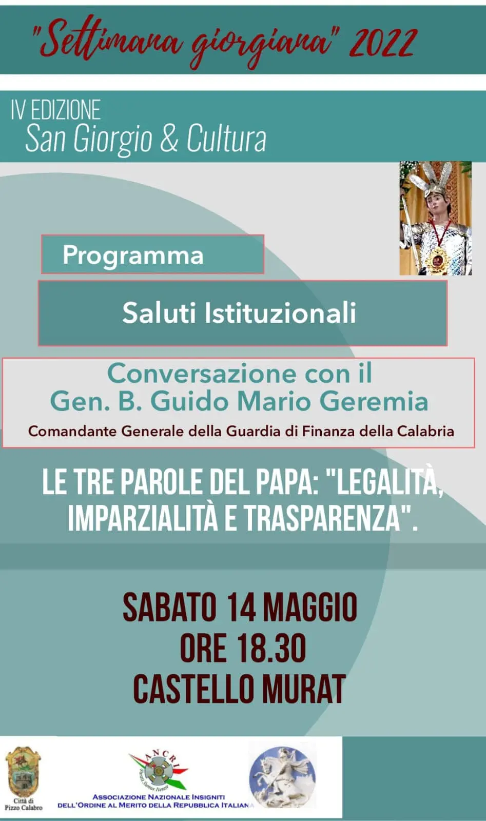 In un periodo storico in cui molti principi, essenziali per il bene della collettività, stanno regredendo sempre più, diverse associazioni tentano di ridare ordine alle cose organizzando incontri di un certo spessore morale. Sabato 14 maggio, alle ore 18:30, nel castello Murat di Pizzo, si terrà un incontro dal nome “Le tre parole del papa: legalità, imparzialità e trasparenza”, promosso dall’Ancri (Associazione nazionale Insigniti dell’ordine al Merito della Repubblica Italiana), in collaborazione con la comunità parrocchiale del duomo di San Giorgio, con il parroco don Pasquale Rosano, e con il patrocinio del Comune di Pizzo. L’incontro avrà luogo nell’ambito del programma “Eventi giorgiani”, facenti parte della IV edizione di “San Giorgio & Cultura”. A seguito dei saluti istituzionali, i presenti potranno ascoltare il generale di brigata Guido Maria Geremia (comandante generale della Guardia di Finanza della Calabria). Un evento attesissimo dalla comunità, considerate le tre tematiche che saranno affrontante e che, mai come questi in questi ultimi anni, hanno bisogno di essere approfondite.