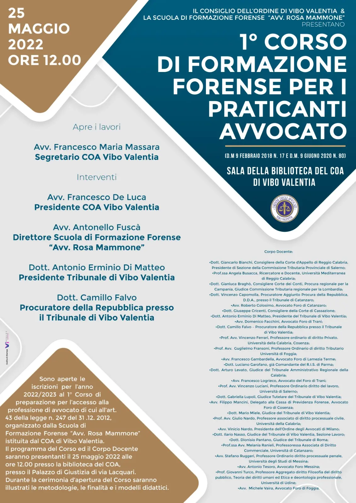 Ad aprire i lavori sarà il segretario del Coa Vibo, avvocato Francesco Maria Massara con gli interventi del presidente del Coa Vibo, avvocato Francesco De Luca, del direttore della Scuola, avvocato Antonello Fuscà, del presidente del Tribunale, dott. Antonio Erminio Di Matteo e del procuratore di Vibo Valentia, Camillo Falvo.