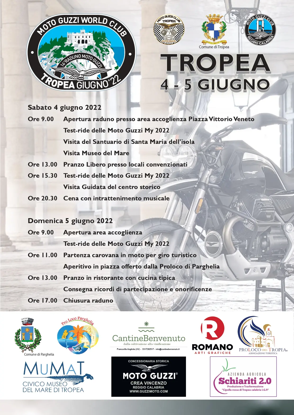 La Perla del Tirreno ospiterà centinaia di motociclisti provenienti da tutta Italia e dall’estero ed insieme agli organizzatori, accoglierà il “popolo guzzista”, da sempre interessato a visitare nuovi posti ed incuriosito dalle arti culinarie dei territori. L’evento sarà articolato su due giornate, sabato 4 e domenica 5 giugno, con un ampio programma che spazia dalle visite guidate del centro storico a quella del Museo del Mare oltre alle immancabili escursioni in moto. Ci sarà anche l’opportunità di effettuare un test-ride degli ultimi modelli Moto Guzzi.