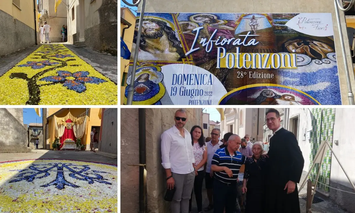 Parole di elogio sono state pronunciate dal sindaco, Lidio Vallone che insieme al parroco padre Luigi Scordamaglia e all’ultracentenaria del paese la signora Peppina, ha dato il via alle visite dei rioni: «Si tratta di un evento che ha ormai superato i confini di campanile. È nato su impulso di padre Lorenzo Di Bruno (parroco di Potenzoni per tantissimi anni) che trasmise ai parrocchiani i principi fondamentali di questa iniziativa. Oggi l’Infiorata si è allargata e vede la collaborazione anche di volontari e associazioni. Anche l’ordine pubblico viene curato dalla Protezione civile e Croce rossa». Rimarcato il senso profondo dell’appuntamento: «Ha un grande significato sia religioso che artistico, le tecniche – ha chiosato il primo cittadino – con il tempo si sono affinate e tutte le opere vengono curate nei minimi particolari. Tant’è che le figure, scene tratte dalla Bibbia o immagini sacre, sembrano scolpite sull’asfalto. Uno spettacolo unico, una vera lode a Dio».