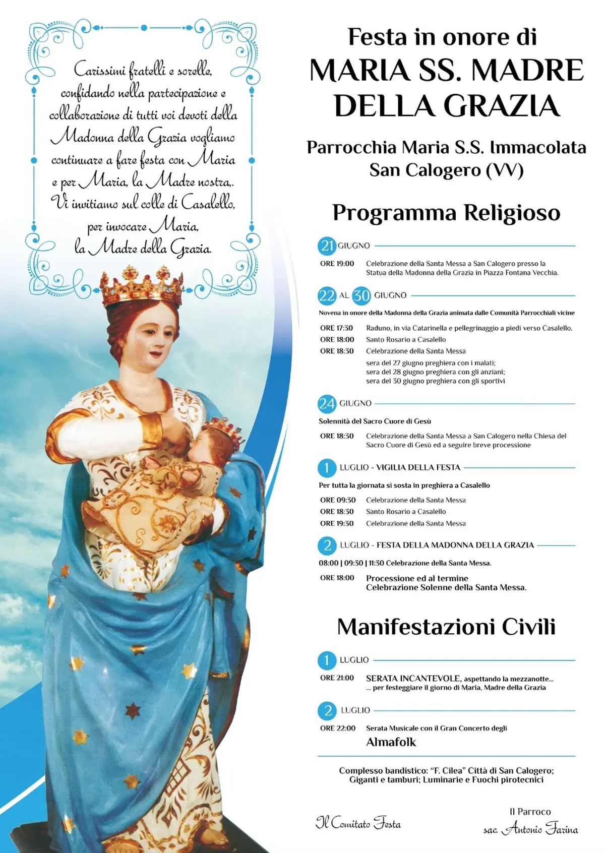 Venerdì primo luglio per tutta la giornata si sosterà in preghiera a Casalello mentre in serata avrà luogo, per le manifestazioni civili, la “serata incantevole”. Sabato si terrà il clou della festa con le celebrazioni, a più riprese, delle sante messe seguite dalla processione prevista per le 18. Al termine della giornata avrà luogo il concerto degli Almafolk. Non mancheranno, in occasione della giornata del 2 luglio le marce intonate dal complesso bandistico Francesco Cilea di San Calogero, i ritmi ipnotizzanti dei tamburi dei giganti Mata e Grifone, le luminarie e i fuochi pirotecnici.
