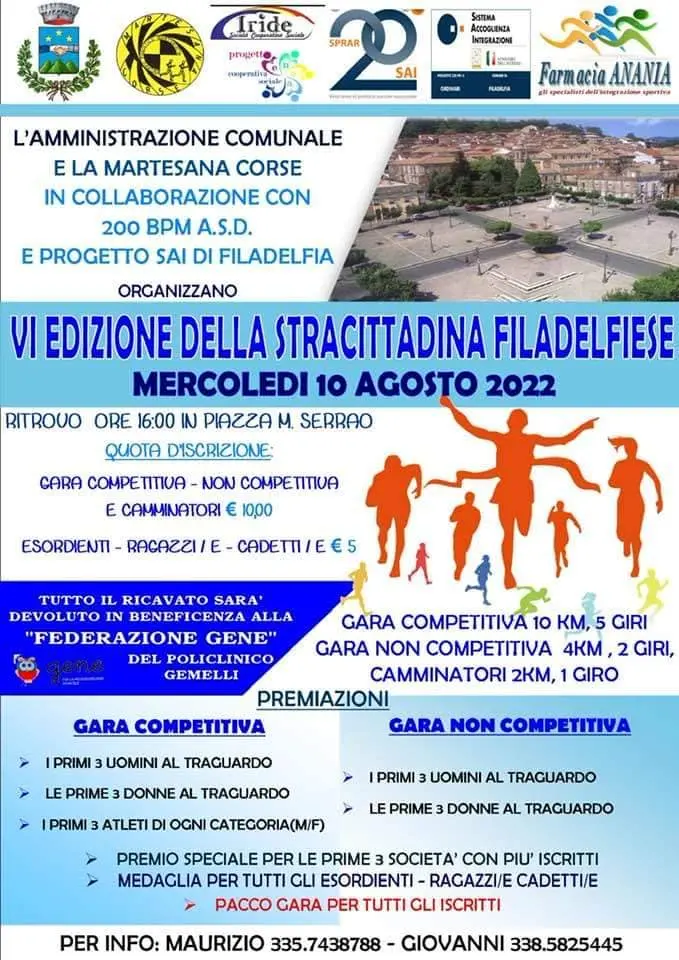 Si corre per vincere, per partecipare, ma si può correre soprattutto per curare. La “Stracittadina” di Filadelfia, giunta ormai alla VI edizione, coinvolge mente e corpo di tanti atleti, adulti e bambini, che prendono parte alla manifestazione podistica non competitiva. L’evento si terrà domani, mercoledì 10 agosto, ed è aperto a tutti. La quota di iscrizione è di 10 euro per adulti e 5 euro per bambini e ragazzi. Le gare/corse saranno di vario tipo: la competitiva di 10 km con 5 giri (per tesserati Fidal), la non competitiva di 4 km con 2 giri, i camminatori 2 km con un giro ed infine i bambini e ragazzi 100, 200 e 800 metri. I veri protagonisti in questa giornata di festa sportiva saranno i piccoli pazienti del reparto di Neurochirurgia infantile che la Federazione Gene del Policlinico Gemelli di Roma accoglie e sostiene quotidianamente, insieme alle loro famiglie. È a loro che va ogni anno l’intero ricavato della manifestazione sportiva, l’evento che, con grande soddisfazione di cittadini e organizzatori, ha ricevuto per la prima volta nel 2022 l’omologazione Fidal (Federazione Italiana di Atletica Leggera). Tutti gli iscritti riceveranno la maglietta della manifestazione e il pacco gara con prodotti locali. [Continua in basso]