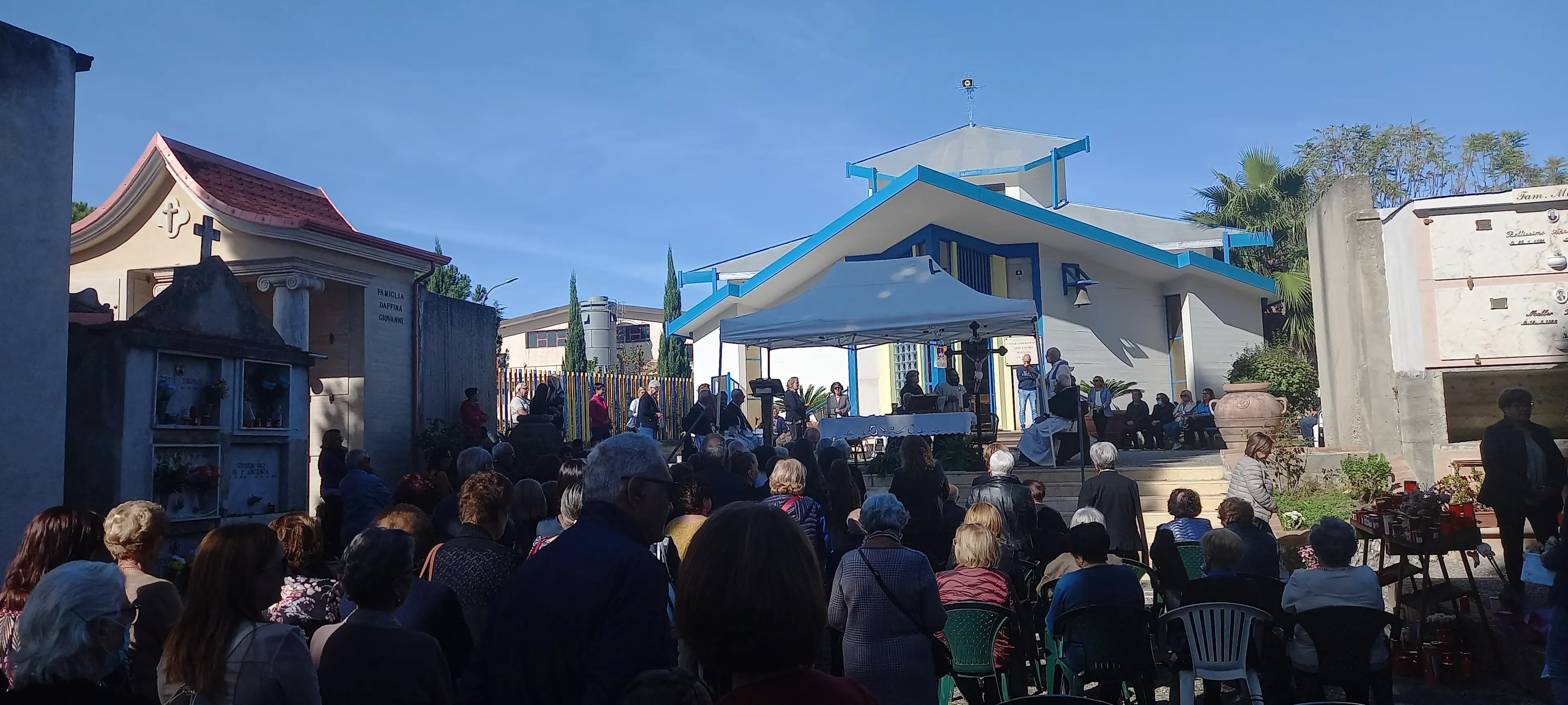 Nel giorno della Commemorazione dei defunti si rinnovano le tradizioni religiose delle messe in suffragio, delle preghiere e delle recite comunitarie del rosario nei cimiteri. Ed è proprio per tale occasione che questa mattina, a Soriano Calabro, si è svolta – come ogni anno – la tradizionale cerimonia religiosa presso il cimitero posto all’entrata del popoloso centro delle Preserre vibonesi. Un momento particolarmente sentito dalla comunità, che anche in questa occasione non ha voluto mancare l’appuntamento. Ad officiare la funzione sono stati mons. Vincenzo Rimedio, Vescovo emerito, don Pino Sergio, parroco di Soriano e il rettore del Convento di San Domenico, alla presenza, tra gli altri, dei confratelli della Confraternita Gesù e Maria del S.S. Rosario, i quali, si sono recati in processione dal Santuario domenicano al luogo sacro. Alla celebrazione hanno anche preso parte, come di consueto, diverse famiglie della città capoluogo originarie di Soriano, che presso il cimitero del centro conservano i loro cari estinti. L’occasione, partecipata, rappresenta anche un importante momento di riflessione sul valore della vita, del tempo che scorre e di ciò che può essere indispensabile incorniciare nella quotidianità: i valori, perchè essi rimangono anche dopo la nostra morte.