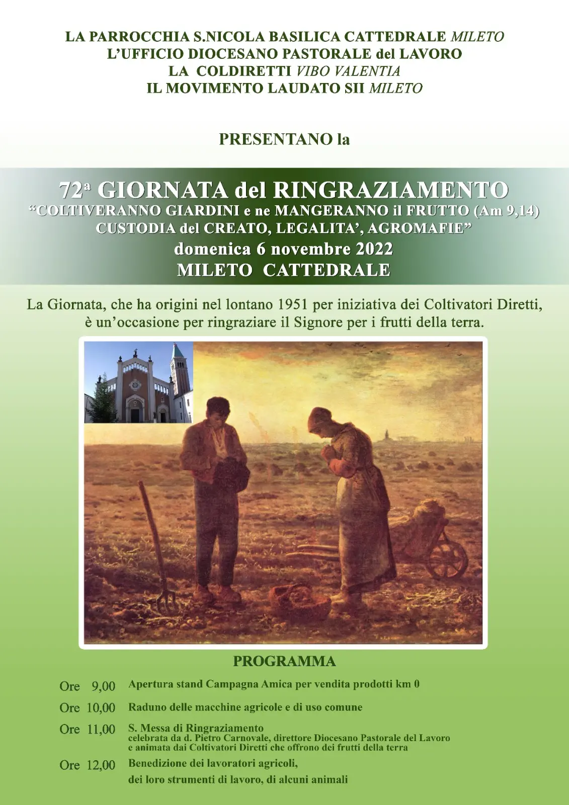 Ritorna la tradizionale Giornata nazionale del Ringraziamento, promossa annualmente dalla Coldiretti. L’appuntamento è previsto per domani 6 novembre. A livello provinciale anche quest’anno i partecipanti si ritroveranno a Mileto, nei pressi e all’interno della basilica cattedrale. Per l’occasione la Coldiretti si avvarrà della collaborazione della locale comunità parrocchiale Santa Maria Assunta-San Nicola, dell’Ufficio diocesano per la Pastorale del lavoro e del movimento “Laudato sii”. Il programma della giornata prevede alle 9 l’apertura degli stand “Campagna Amica” per la vendita di prodotti agroalimentari a Km 0. Alle 10, invece, si svolgerà il raduno delle macchine agricole e di uso comune, a cui farà seguito la messa di ringraziamento che sarà celebrata dal direttore diocesano per la Pastorale del lavoro don Pietro Carnovale. La celebrazione eucaristica, in programma alle 11 nella chiesa madre della diocesi di Mileto-Nicotera-Tropea, sarà allietata dagli stessi Coltivatori diretti, i quali, nell’occasione offriranno dei frutti della terra. La Giornata del Ringraziamento, giunta quest’anno alla sua 72esima edizione, si concluderà alle 12 con un altro momento significativo. Nello specifico con la benedizione dei lavoratori agricoli, dei loro strumenti quotidiani di lavoro e di alcuni animali. L’iniziativa è stata ideata nel 1951 dalla Coldiretti, con l’intento di creare un momento annuale di preghiera e di ringraziamento al Signore per i frutti della terra elargiti. Il tema dell’edizione 2022 è “‘Coltiveranno giardini e ne mangeranno il frutto’ (Am 9,14). Custodia del creato, legalità, agromafie”. Al riguardo, nel messaggio di presentazione della Giornata, la Cei mette in evidenza come, ancor di più in un momento di grave crisi economico-sociale come quello che viviamo, sia assurdo continuare a investire risorse in armi e non in agricoltura, facendo «tornare attuale il sogno di Isaia di trasformare le spade in aratri, le lance in falci».