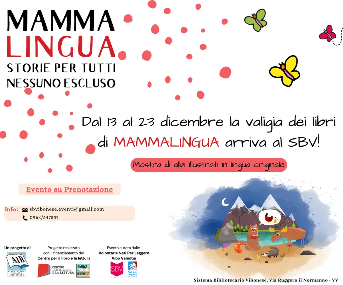 Dopo aver viaggiato per tutta l’Italia, finalmente la valigia di “Mamma lingua – Storie per tutti, nessuno escluso” approda – dal 13 al 23 dicembre prossimi – al Sistema bibliotecario vibonese. Più di 100 volumi selezionati tra la migliore letteratura per bambine e bambini nelle lingue ufficiali del progetto (albanese, arabo, cinese, polacco, tedesco, romeno, urdu, hindie, ecc.) saranno disponibili in biblioteca fino al 23 dicembre, organizzati in una piccola mostra visitabile da scuole e famiglie, su prenotazione.