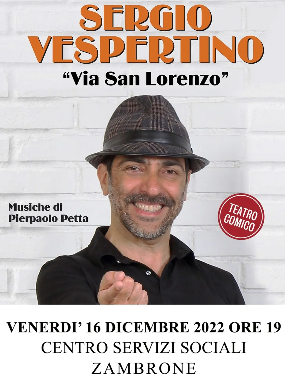 “Via San Lorenzo” il nuovo esilarante spettacolo dell’attore siciliano, che regalerà sorrisi, divertimento e spunti di riflessione. Questa sera a Zambrone, presso il Centro servizi sociali, alle ore 19.00, Sergio Vespertino si esibirà nella sua nuova produzione, un racconto che mette insieme temi profondi e giocosi che ruotano intorno all’esistenza umana e al destino di ognuno di noi. Le musiche saranno curate da Pierpaolo Petta. L’attore siciliano, considerato uno dei migliori attori di teatro comico, è già stato a Zambrone tre anni fa e ha incantato il pubblico con la sua verve comica espressa nel suo storico cavallo di battaglia, “Fiato di madre”. Al suo attivo anche molti film, fra cui: “La concessione del telefono – C’era una volta Vigata” tratta dall’omonimo libro di Andrea Camilleri, “La mafia uccide solo d’estate” e, di recente, ha interpretato il ruolo del Maresciallo Guareschi nella serie televisiva “Makari”. Un lavoro incessante, fra teatro, cinema e fiction che testimonia la versatilità dell’artista palermitano. Ad arricchire la serata anche una mostra d’arte e di artigianato che si svolgerà in contemporanea e nella stessa struttura comunale.