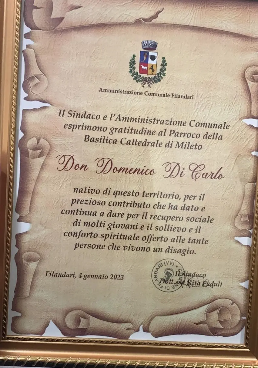 «Il sindaco e l’amministrazione comunale esprimono gratitudine a don Domenico Dicarlo, nativo di questo territorio, per il prezioso contributo che ha dato e continua a dare per il recupero sociale di molti giovani e il sollievo e il conforto spirituale offerto alle tante persone che vivono nel disagio». Questa la motivazione alla base del riconoscimento assegnato dal Comune di Filandari, guidato dal sindaco Rita Fuduli, al parroco della basilica cattedrale di Mileto don Mimmo Dicarlo, nativo della frazione Scaliti. La storica guida della comunità parrocchiale della chiesa madre della diocesi di Mileto-Nicotera-Tropea da decenni opera al fianco degli ultimi, rischiando in alcuni casi anche la vita. È lui, tra l’altro, il “padre” fondatore dell’associazione Maranathà, da oltre trent’anni ente gestore di un Centro di prima accoglienza e di un Comunita’ terapeutica residenziale a sostegno di coloro che abusano di droghe, psicofarmaci e alcol. [Continua in basso]