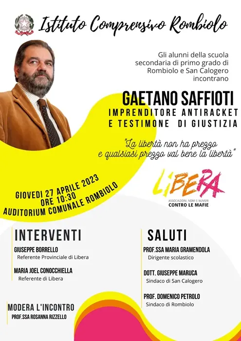 Saffioti è un imprenditore di Palmi, nel 2002 dopo anni di vessazioni da parte della ‘ndrangheta decise di denunciare il tutto alla magistratura. Con le sue dichiarazioni, ha contribuito ad alcune delle più importanti operazioni contro le cosche reggine. Oggi vive sotto scorta e porta avanti la sua testimonianza: domani, 27 aprile, ad ascoltarlo ci saranno i ragazzi di Rombiolo e San Calogero.