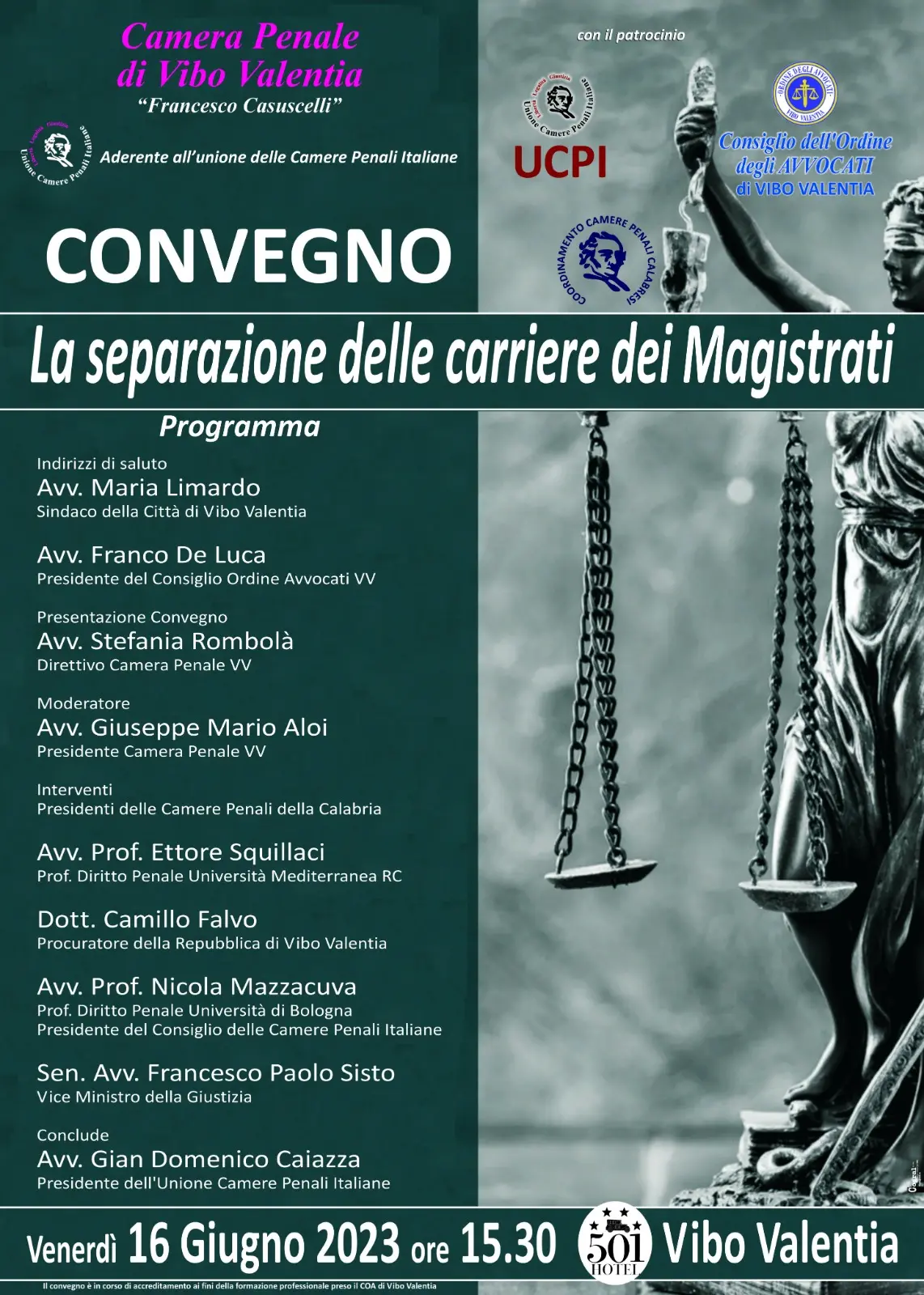 La Camera penale di Vibo Valentia promuove per venerdì 16 giugno il convegno dal titolo “La separazione delle carriere dei magistrati”. L’appuntamento, con inizio alle ore 15.30, nei saloni del 501 hotel. Il tema sarà affrontato grazie ad autorevoli contributi. Ai saluti del sindaco di Vibo, Maria Limardo, e del presidente del Consiglio Ordine avvocati Vibo Valentia, Franco De Luca, seguirà la presentazione a cura dell’avvocato Stefania Rombolà, del direttivo della Camera penale Vibo. A seguire, gli interventi di Ettore Squillaci, professore di Diritto penale all’Università Mediterranea di Reggio Calabria; di Camillo Falvo, procuratore della Repubblica di Vibo Valentia; di Nicola Mazzacuva, professore di diritto penale all’Università di Bologna nonchè presidente del Consiglio delle Camere penali italiani, e il vice ministro della Giustizia Francesco Paolo Sisto. Le conclusioni del convegno, moderato dal presidente della Camera penale di Vibo Giuseppe Aloi, sono affidate all’avvocato Gian Domenico Caiazza, presidente dell’Unione delle Camere penali italiane.