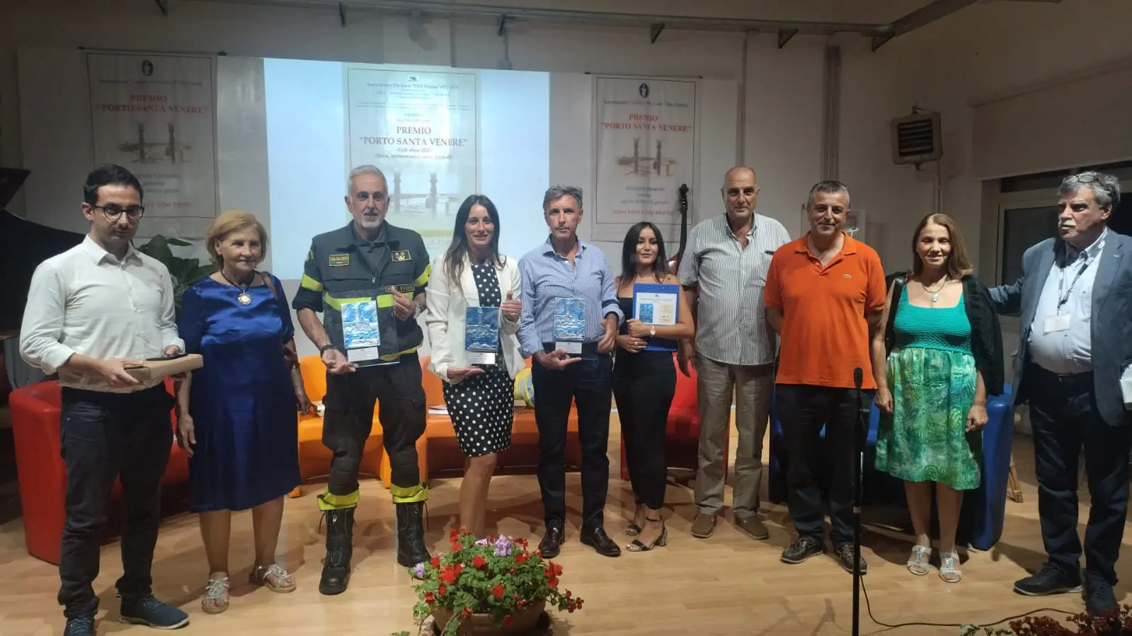 La Pro Loco ha offerto come riconoscimento un’opera significativa realizzata in esclusiva per il Premio dal versatile artista Antonio La Gamba, un pregevole bassorilievo contenenti simboli identitari, così spiegati dallo stesso autore, “ il faro che squarcia il buio dell’ignoranza. Il mare entità viva in simbiosi con l’uomo da proteggere e tutelare. Gli scogli, difficoltà che si frappongono al raggiungimento degli obiettivi. Il frammento in marmo memoria e radici di santa Venere. Il gabbiano simbolo di libertà, che si innalza in volo per raggiungere nuovi orizzonti”. La Camera di Commercio ha inoltre fatto omaggio di un libro importante “Il porto ritrovato” documenti e atti per la storia del Porto di Santa Venere, una impegnativa ricerca dello storico Antonio Montesanti. “La serata ha visto la collaborazione di Ilenia Iannello del gruppo soci giovani della Pro Loco, l’esibizione dei tre musicisti Simon Stanganello pianoforte, Eleonora Forelli chitarra , Rita Cannavino pianoforte. La partecipazione del personale operativo dei Vigili del Fuoco di Vibo Marina con due mezzi terrestri di soccorso, dell’ ingegnere Domenico Attisani già direttore dei Vigili del Fuoco della Calabria, di Virgilio Rombolà con una nutrita delegazione dell’ Associazione Nazionale Vigili del Fuoco Vibo Valentia, del Comandante della Stazione Carabinieri di Vibo Marina Alessandro Feleppa, del tenente Gabriele Abbadessa in rappresentanza Capitaneria di Porto, di mons. Filippo Ramondino amministratore della Parrocchia di Vibo Marina. Nel corso della serata vi è stato anche un collegamento telefonico commovente da Porto Santo Stefano con Anna Borelli, sorella di Ido, il giovane deceduto nello scoppio della petroliera “Soreghina” insieme a Antonio Maggini e Giovanni Lippi che ha ricordato l’evento accaduto nel lontano 1962, ringraziando ancora quanti all’epoca si sono prodigati nell’opera di soccorso tra civili e VdF; dopo quella tragedia si è compreso quanto fosse indispensabile una postazione dei Vigili del Fuoco a Vibo Marina, aperta nel 1985 e che rimane indispensabile. Un ringraziamento particolare va al dirigente Sangeniti e al prof. Mamone dell’l’Istituto A. Vespucci che ha ospitato il premio nell’importante scuola, al presidente di LaC Domenico Maduli, ai vivai fratelli Amoroso, agli organi di stampa. Il Premio è il frutto dell’impegno di tutti i soci, dei i volontari, degli amici della ProLoco, di quanti a vario titolo si sono adoperati per il successo della serata ed un momento di convivialità, espressione di una Comunità unità che ha una sua storia, vive il suo presente, desidera un futuro migliore”, ha concluso la Pro Loco.