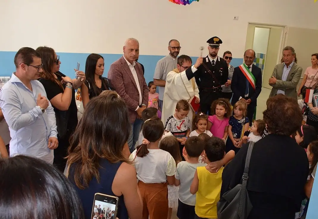 La cerimonia inaugurale di apertura della nuova scuola per l’infanzia si è svolta alla presenza, tra gli altri, del sindaco Salvatore Fortunato Giordano, dell’assessore al ramo Francesco Ciccone, del dirigente scolastico dell’Istituto comprensivo, Antonello Scalamandrè, del nuovo comandante della stazione dei carabinieri, Alessio Conte, e del comandante di Polizia municipale, Renato Parrone. Dopo i saluti delle varie autorità del territorio, lo svelamento della targa di intitolazione della scuola e il classico taglio del nastro, il cerimoniale ha previsto il solenne rito di benedizione dei locali, impartito da don Giuseppe Pititto. Presenti all’evento anche il parroco della Badia, don Salvatore Cugliari, e quello di Comparni e San Giovanni don Agostino Pugliese.