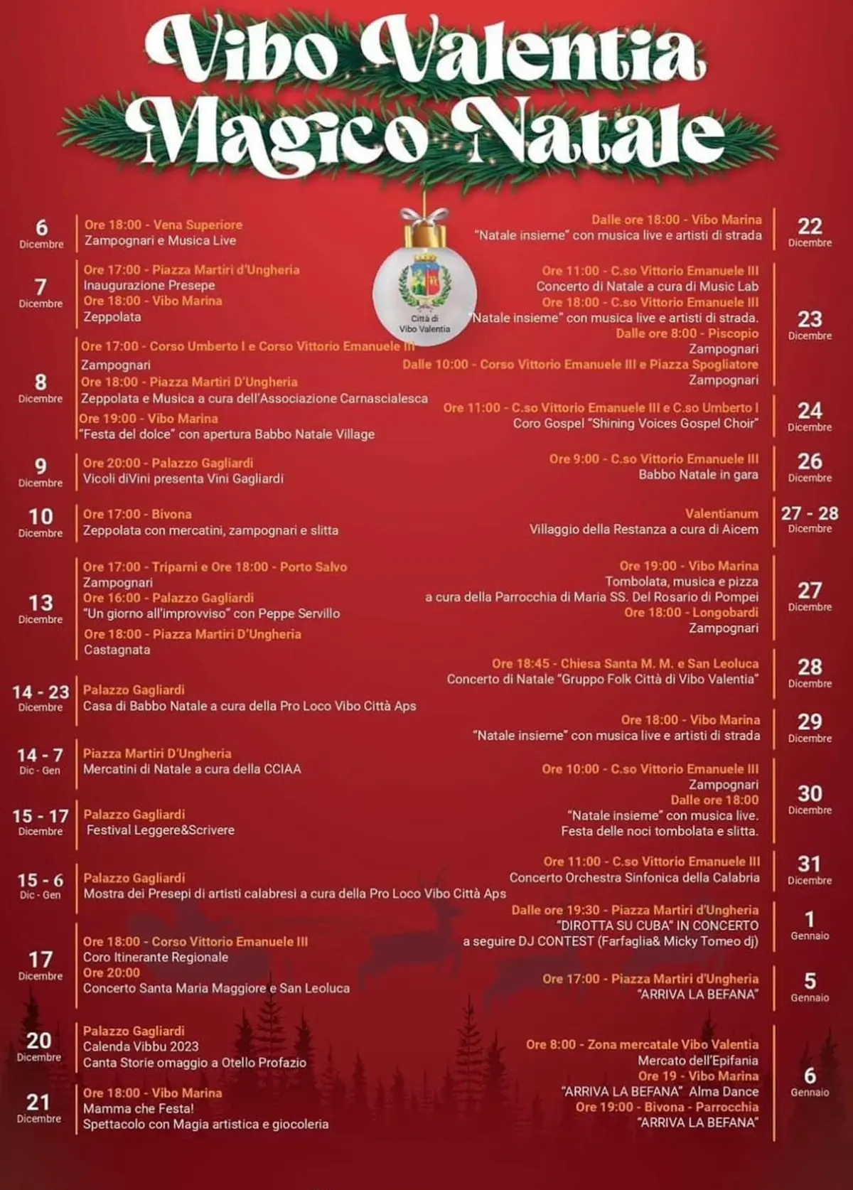 Il de profundis del Natale a Vibo continua poi con il mancato allestimento dei mercatini che – come da locandina del “Magico Natale” voluto dall’amministrazione Limardo – dovevano vedere la luce in piazza Municipio dal 14 dicembre al 7 gennaio. Chi li ha visti? Al momento nessuno ed anche in questo caso nessun assessore, sindaco o consigliere delegato ha inteso fornire spiegazioni alla città sul mancato allestimento, neanche attraverso un misero post sul solito Facebook (la comunicazione istituzionale ad alcune latitudini – leggasi Vibo Valentia – è andata a farsi benedire già da tempo). In attesa anche dei concerti settimanali in programma sin dal 30 novembre, commercianti e cittadini lamentano poi l’assenza del concerto di Capodanno nella notte a cavallo tra il 31 dicembre e giorno 1 gennaio. Si consolida invece la “tradizione” tutta vibonese (e in solitaria rispetto al resto del mondo) che vuole il “concerto” di Capodanno in programma per giorno 1 gennaio 2024 alle ore…19:00 con i Dirotta su Cuba e a seguire Dj Contest. Fra chi – tra commercianti e cittadini – pretende delle scuse da parte dei pubblici amministratori per essere riusciti nella non facile impresa di “spegnere”, nei fatti, anche il Natale a Vibo Valentia (non mantenendo fede neanche al programma degli eventi), c’è chi fa notare che persino nei paesi della provincia – da Nicotera a Tropea passando per Pizzo e Serra San Bruno – si respira per le strade l’aria della festività, con tanto di luminarie, vie del vischio e altro, che hanno attirato sinora parecchi visitatori A Vibo Valentia, invece – da capoluogo di provincia (nonostante l’impegno dei commercianti) – si resta in attesa di un Natale che, probabilmente, è stato sinora acceso solo nelle private abitazioni degli amministratori e, naturalmente, su…Facebook [GUARDA FOTO IN BASSO]