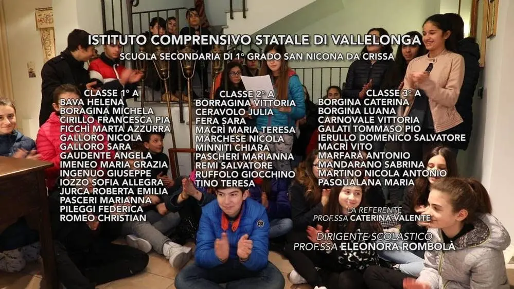 Nell’ambito del concorso, sono state premiate diverse scuole calabresi tra cui la scuola media di San Nicola da Crissa dell’Istituto di Vallelonga (guidato dal dirigente scolastico Eleonora Rombolà), che ha ottenuto la medaglia “Stella d’argento”. Nello specifico, gli studenti hanno inteso adottare il museo della Confraternita del Santissimo Crocifisso, dove si custodiscono reperti, documenti inerenti la secolare devozione religiosa della piccola comunità. Sono i ragazzi stessi, attraverso il filmato realizzato dal video reporter di LaC Tv, Saverio Caracciolo e sotto la supervisione della referente del progetto, la professoressa Caterina Valente, a raccontare la storia del sito e le opere facenti parte del corredo liturgico della Confraternita. Così come il Crocefisso del miracolo, simulacro ligneo cinquecentesco che sudò più volte dinnanzi agli occhi esterrefatti dei fedeli. Un viaggio nelle tradizioni e religiosità popolari affinché non se ne perda la memoria: «Gli alunni – ha spiegato la docente Valente – hanno aderito con vivo interesse, consultando fonti antiche, facendo ricerche ed interviste, ascoltando gli studiosi del territorio, tra cui il professore Vito Teti». Un lavoro collettivo che ha coinvolto 36 ragazzi e tre classi: «L’intento – ha aggiunto – era quello di far conoscere la storia del paese e questo museo unico nel suo genere. Essere rientrati nel medagliere nazionale – ha infine concluso la professoressa – è stato motivo d’orgoglio».
