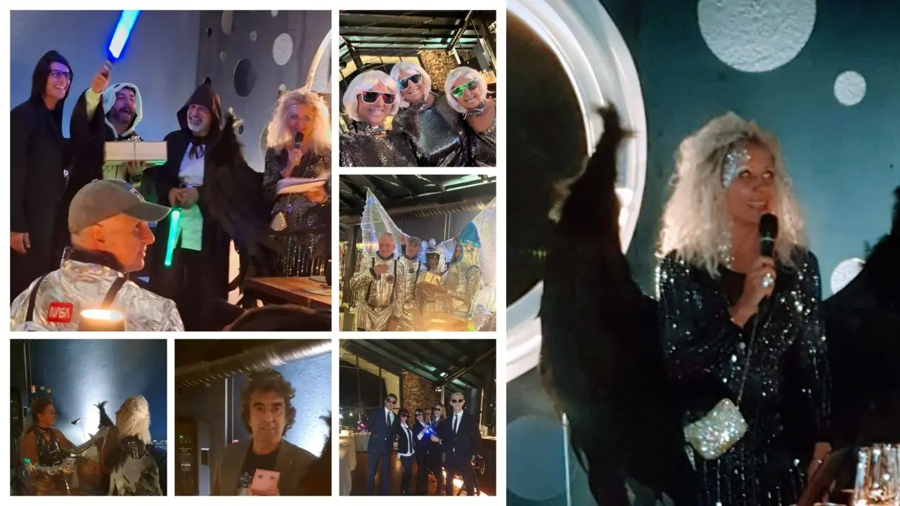 «Tutti gli ospiti, come da invito – si legge in una nota -, sono arrivati in costumi “stellari”, molti i gruppi a tema, sono arrivati i Man in Black spaziali, i Guerre Stellari, La navetta spaziale con gli astronauti, Stelle solari, uomini di Plutone, le Venusiane, coccinelle stellari, il sole, e a chi il costume non l’ha potuto mettere un simbolo è stato dato all’entrata. Tutti accolti dalle immense ali della padrona di casa vestita da angelo lunare. La giuria questa volta ha premiato tutti i gruppi davvero unici nel loro costume, oltre alla coccinella stellare (Stefania) e il Dandy dello spazio (Filippo), questi ultimi hanno ricevuto premi, collana e gemelli, donati sempre dalla Gioielleria Franzè di Vibo Valentia».