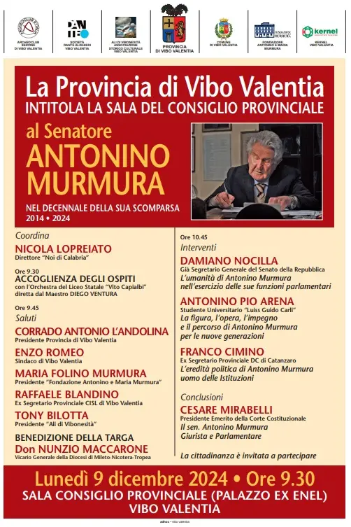 Ad aprire i lavori, coordinati da Nicola Lopreiato (direttore Noi di Calabria), i saluti del presidente della Provincia Corrado L’Andolina, del sindaco Enzo Romeo, della presidente della fondazione Antonino e Maria Murmura, Maria Folino Murmura, dell’ex segretario provinciale Cisl Raffaele Blandino e del presidente di Ali di Vibonesità Tony Bilotta. Ad accogliere gli ospiti, l’orchestra del liceo Capialbi diretta dal maestro Diego Ventura. A benedire la targa, don Nunzio Maccarone, vicario generale della Diocesi di Mileto-Nicotera-Tropea. Previsti gli interventi di Damiano Nocilla, già segretario generale del Senato, Antonino Pio Arena, studente Liuss Guido Carli, Franco Cimino, ex segretario provinciale Dc di Catanzaro. Le conclusioni verranno affidate a Cesare Mirabelli, presidente emerito della Corte costituzionale.