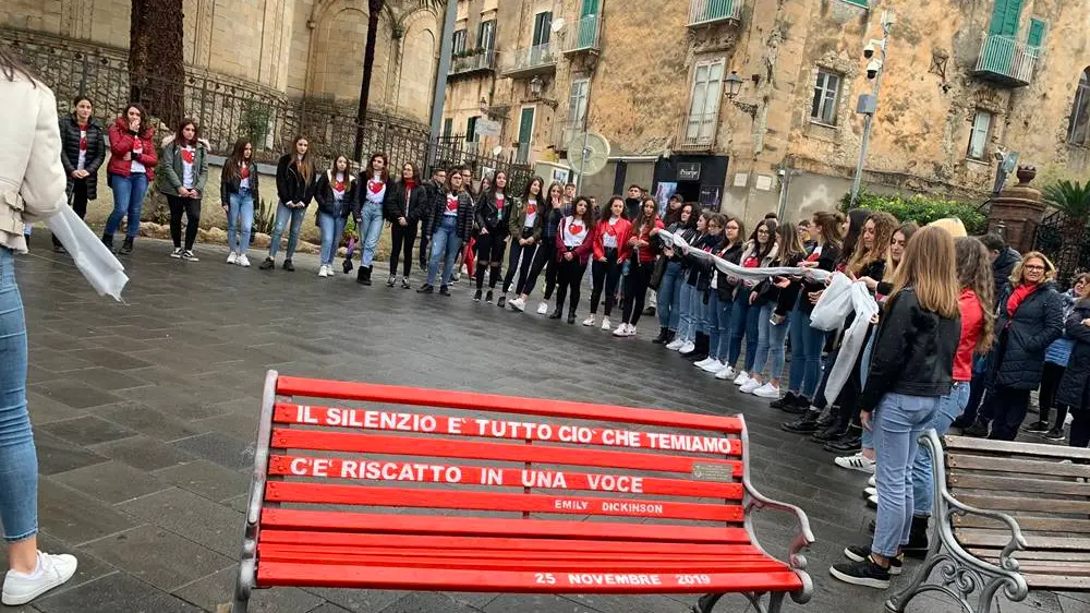 Da ieri, lunedì 25 novembre, in largo Duomo a Tropea, alle spalle della cattedrale, spicca, nel suo brillante rosso, una panchina, tra le tante distribuite lungo la suggestiva piazza che guarda il porto e le chiese di San Francesco e della Michelizia. Chi si avvicina a guardarla scopre che è stata realizzata, in occasione della Giornata Internazionale contro la Violenza sulla Donna, dal Comune in collaborazione con l’Istituto superiore e l’associazione Sos Korai onlus. Sulle sue doghe campeggiano i versi della grande poetessa Emily Dickinson: “Il silenzio è tutto ciò che temiamo. C’è riscatto in una voce”. L’inaugurazione ha visto il piazzale gremito di studenti e di cittadini. «Effettivamente – spiegano i promotori – ne è valsa la pena perché l’emozione è stata tanta e viverla intensamente ha suscitato una sensazione di profondo benessere. Splendido lo spettacolo delle ragazze e dei ragazzi che, disposti a semicerchio davanti al magico punto rosso, ammirati frontalmente dagli adulti, altrettanto emozionati e gioiosi di soddisfazione, hanno, lentamente, svelato la panchina raccogliendo il lungo velo drappeggiato a coprirla. Fino all’ultimo si era temuto di non poter concludere così l’intenso momento preparatorio svoltosi al Santa Chiara, ma, quasi per magia, il cielo nero si è improvvisamente alleggerito dai nuvoloni che preannunciavano la pioggia».