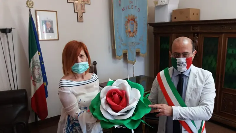 Una rosa gigante interamente realizzata a mano e con i colori della bandiera italiana. Questo il bel regalo consegnato a Palazzo dei Normanni al sindaco di Mileto, Salvatore Fortunato Giordano, e al resto degli esponenti comunali. A rendersi protagonista dell’apprezzabile gesto, l’artista Teresa Sorrentino, la quale ha voluto omaggiare personalmente l’amministrazione cittadina con una delle sue preziose composizioni in gomma, in occasione dell’annuale Festa della Repubblica del 2 giugno. La grande rosa tricolore – così come spiegato dalla brava creatrice miletese – “rappresenta l’Italia che rifiorisce e che sboccia dopo il lungo periodo di chiusura del Paese, dovuto alla pandemia da Covid-19”. Un gesto di buon augurio, dunque, che il sindaco Giordano e il resto dei consiglieri sperano porti fortuna alla popolazione miletese e all’intera Nazione, messe duramente alla prova dal propagarsi del coronavirus e dalla conseguente fase di lockdown.