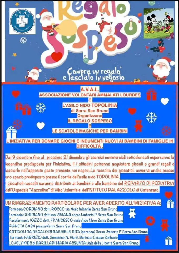 La scatola andrà quindi incartata e sarà contraddistinta con un fiocco azzurro se destinata ad un maschietto oppure rosa se destinata ad una femminuccia, indicando in un angolo l’età del bambino che dovrà riceverla. Data l’emergenza sanitaria è richiesto che il contenuto di ogni scatola sia nuovo e mai utilizzato. Nel cortile dell’asilo nido Topolinia è stata allestita una postazione dove depositare le scatole, tutti i giorni in orario mattutino fino al 21 dicembre. Diverse le attività commerciali che hanno aderito all’iniziativa. Il ricavato, grazie alla collaborazione con A.V.A.L., “Associazione Volontari Ammalati Lourdes Onlus”, sarà devoluto alla Pediatria dell’ospedale Jazzolino di Vibo Valentia, all’istituto Palazzolo di Catanzaro e alle famiglie bisognose del territorio. Un piccolo gesto per regalare un sorriso a chi è in difficoltà.
