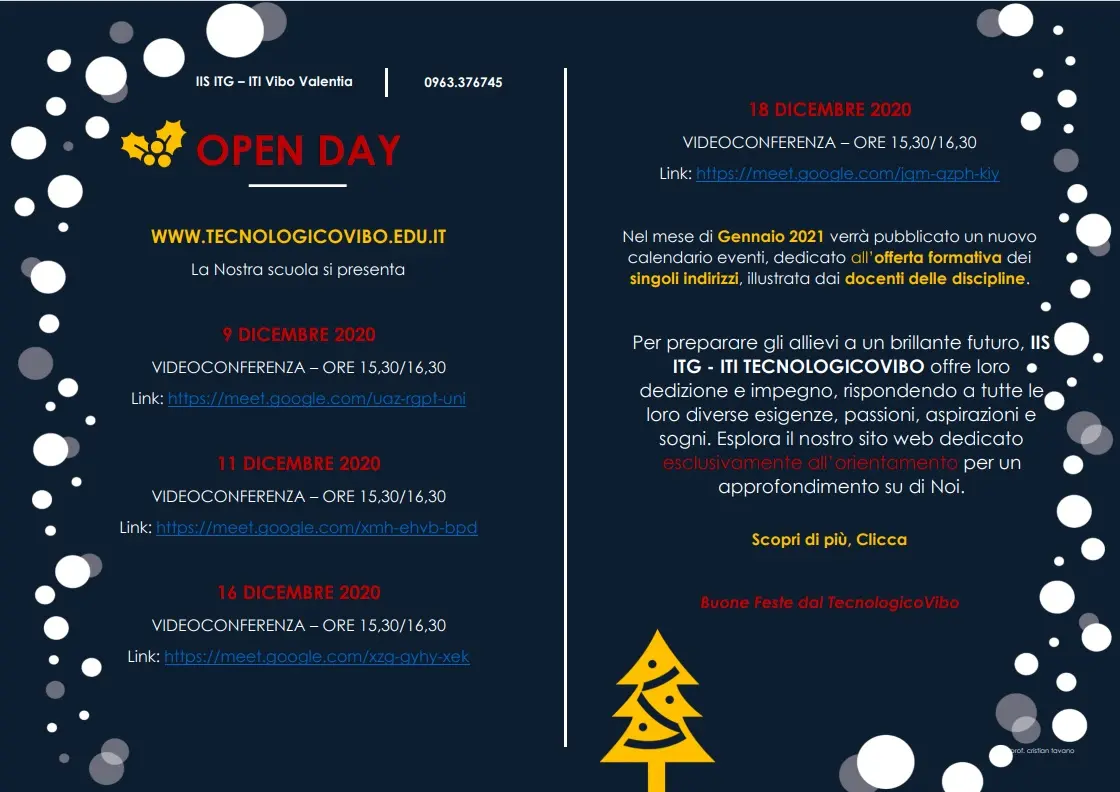 Nell’ambito delle iniziative per l’orientamento in ingresso, l’Iis Itg e Iti di Vibo Valentia, propone una serie di incontri online, attraverso la piattaforma meet, finalizzati alla scelta del percorso scolastico secondario di secondo grado e rivolto a studenti delle ultime classi della scuola secondaria di primo grado e alle loro famiglie che in questo momento si trovano a scegliere il percorso di studi per il prossimo A.s. 2021-‘22. Le iscrizioni saranno attive sulla piattaforma del Miur, appositamente dedicata, dal 4 al 25 gennaio 2021.