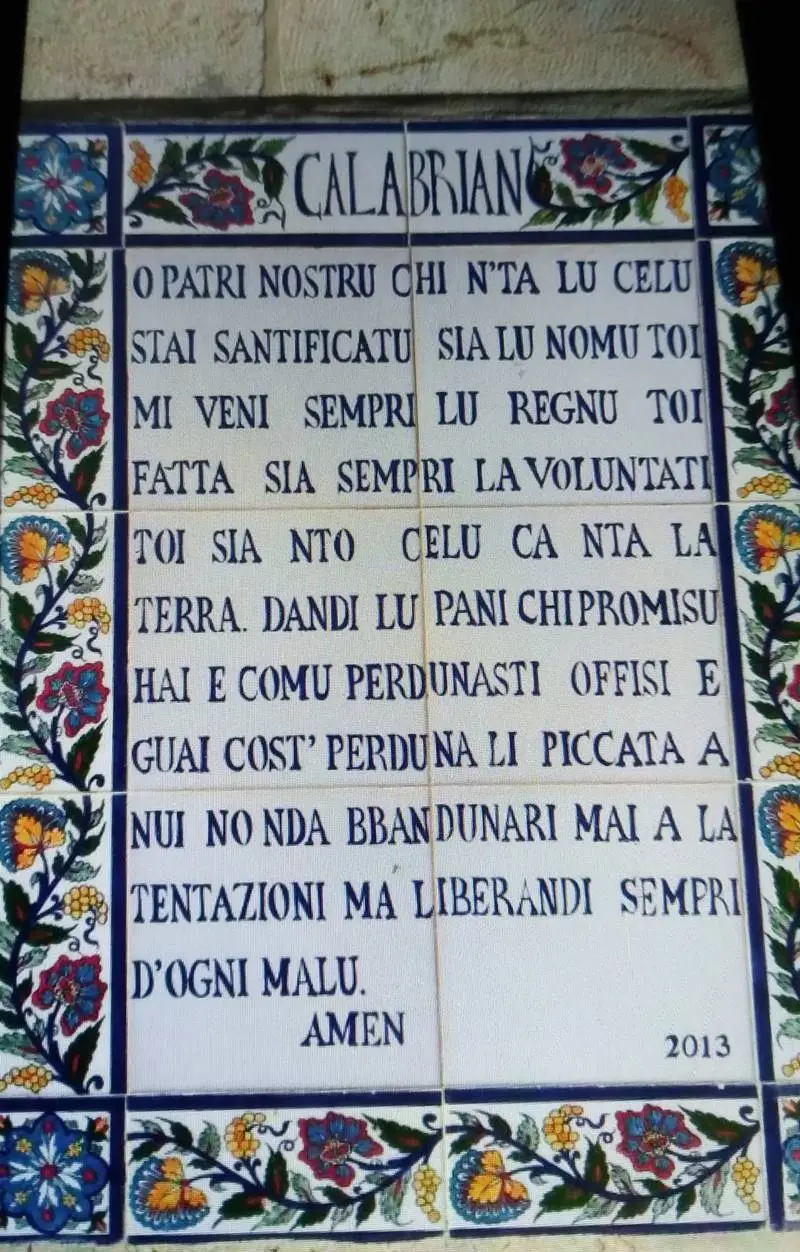 La presenza del Padre Nostro nel proprio dialetto rappresenta, per ogni calabrese a cui capita di visitare questo luogo sacro, un’emozionante sorpresa e un bellissimo onore il cui promotore è stato il professore Filippo Marino, insigne mariologo originario di Palmi, al quale Papa Francesco ha volto dare incarico di redigere una nuova versione della famosa preghiera correggendola nella frase “ Non ci indurre in tentazione”, forse da attribuire ad un’imperfezione di traduzione avvenuta nel corso dei secoli.